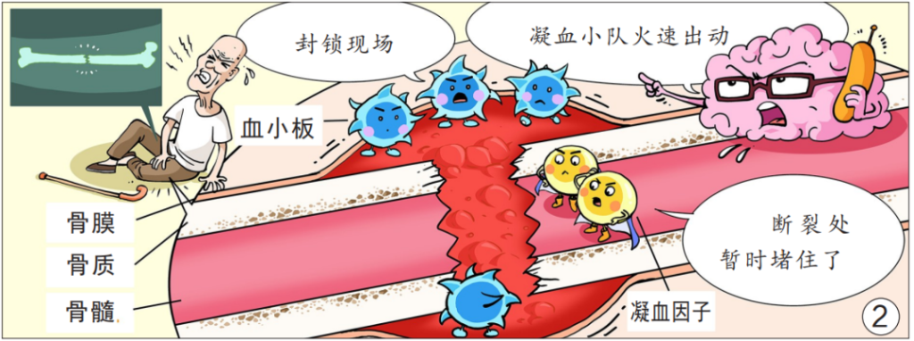 第一階段:血腫炎癥機化期。骨折就像橋梁突然坍塌,骨骼及鄰近組織的血管斷裂、出血,身體會立即拉響“凝血警報”,大量血小板、凝血因子等“搶險隊員”趕赴現場,封鎖事故路段,使骨折斷裂端周圍的血液凝固,形成血塊。從外表來看,傷處會腫脹,局部皮膚呈青紫色。