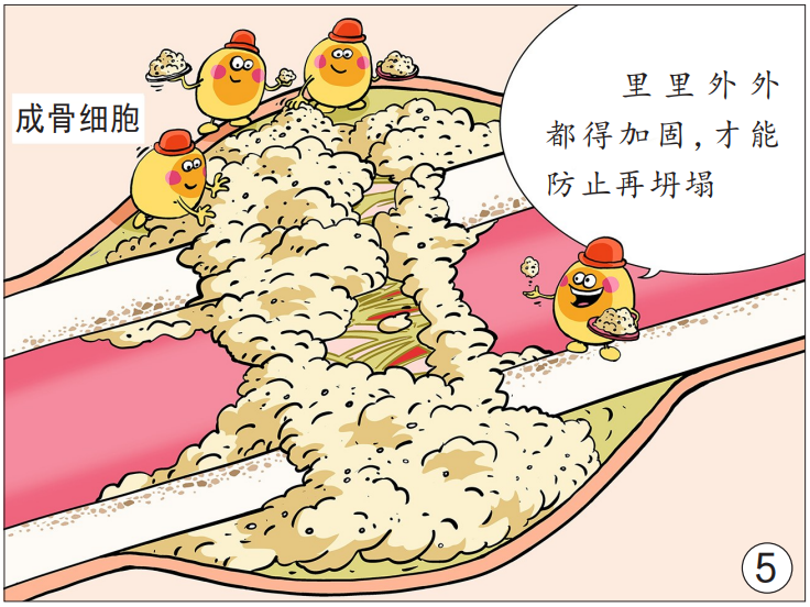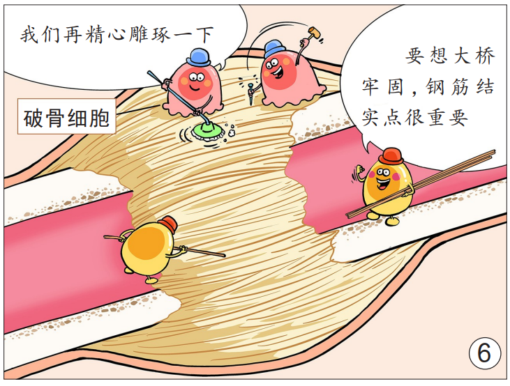 第三階段:骨痂改造期。骨折2個月后,大橋修復工程進入“精裝修”階段。原始骨痂不斷被改造、塑形,成骨細胞和破骨細胞合作,不斷形成新骨,多余的骨痂被吸收,新生的骨小梁也在不斷增加、變粗,且排列緊密、質地均勻,使骨折部位形成堅強的骨性連接。