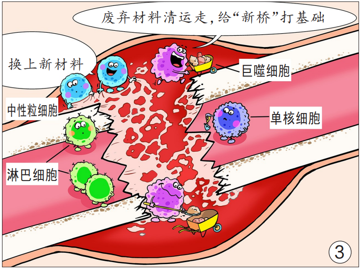 隨后,傷處毛細血管開始增生擴張,中性粒細胞、淋巴細胞、單核細胞、巨噬細胞等進入血腫的骨壞死區,逐漸清除血凝塊、壞死軟組織和死骨,血腫部位逐漸被新生的肉芽組織取代。