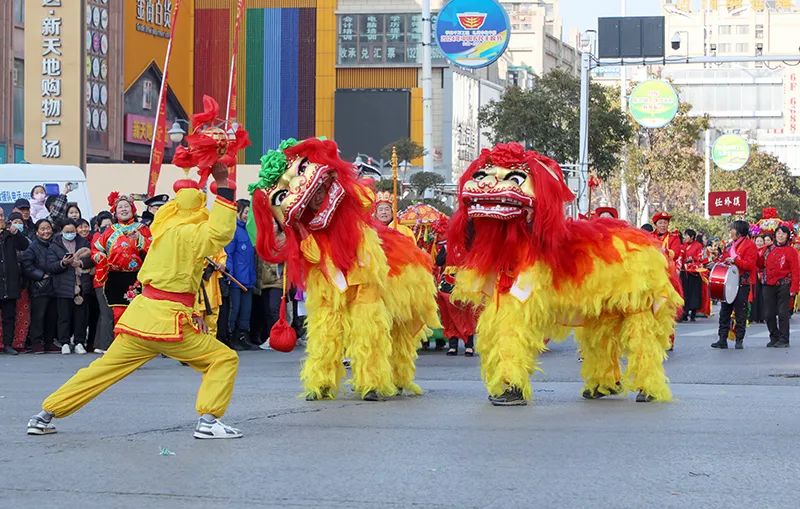 “咚咚咚……”隨著龍鼓之聲響起,民俗踩街活動拉開帷幕,跑驢表演,詼諧幽默,毛驢在馬夫的指引下,上下奔騰;“獨桿轎”伴隨著鼓點的變化,時上時下,“四姥爺”不斷擺出各種高難度造型,向大家拜年。十幾頭神采奕奕的舞獅在行進中跳躍、翻騰、嬉戲,每一個造型的變化都是力量與技巧的碰撞……