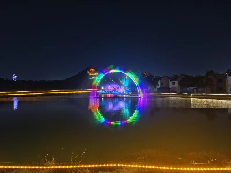 開門見福,龍游四海。一進入景區南大門,首先映入眼簾的便是一個巨大渾厚的龍形燈籠,制作細膩、栩栩如生,盡顯威嚴氣勢。漫步星河長廊,迎客門、國風燈籠墻、麥穗星河、水霧門、七彩花田、金龍賀歲、詩詞長廊等光影幻象紛紛破次元而來,上萬盞精美花燈勾勒出視覺里的中式浪漫,水幕電影的沉浸式場景給人猶如海市蜃樓般的縹緲空靈感,吸引不少游客穿梭其間、拍照打卡。