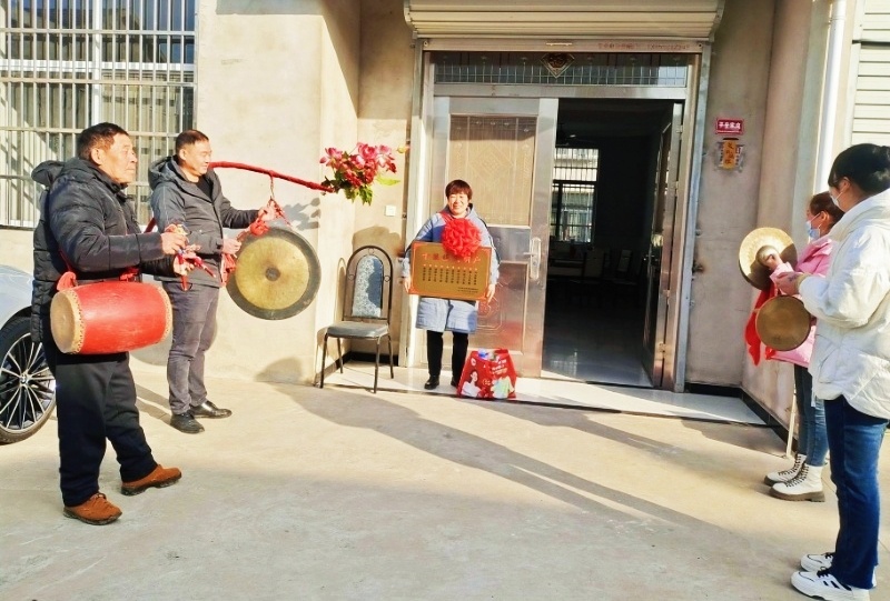 龍廟村用傳統花鼓燈表演為榮獲“十星級文明戶”的家庭送去牌匾。