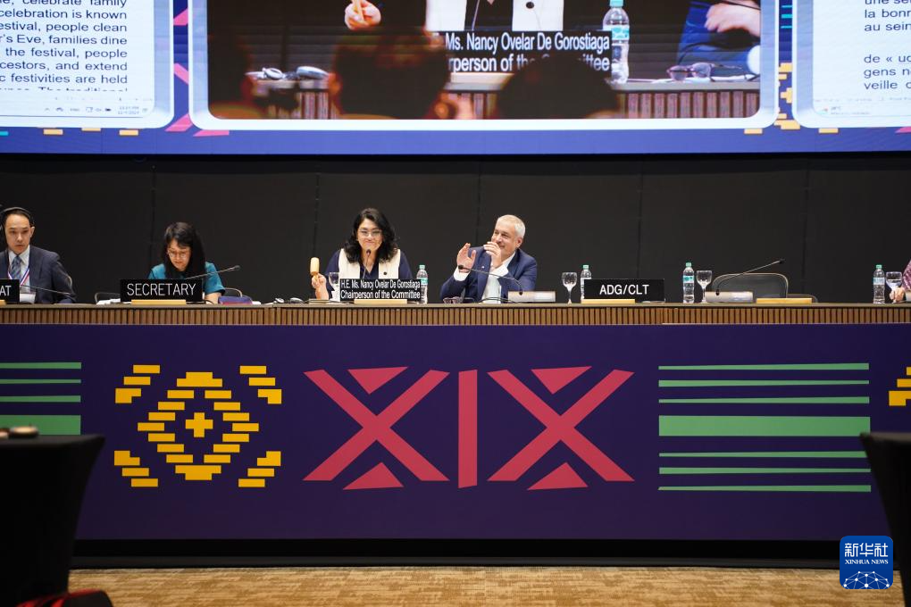 這是12月4日在巴拉圭亞松森拍攝的聯(lián)合國(guó)教科文組織保護(hù)非物質(zhì)文化遺產(chǎn)政府間委員會(huì)第19屆常會(huì)評(píng)審現(xiàn)場(chǎng)。新華社記者 朱雨博 攝
