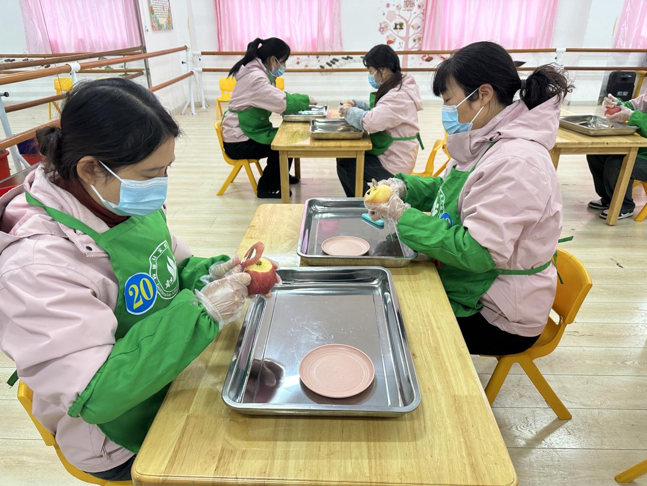 理論印記于心,實(shí)踐落實(shí)于行。實(shí)操部分結(jié)合園所實(shí)際工作,分為五個(gè)環(huán)節(jié):消毒桌面、整理床鋪、梳頭、削水果、點(diǎn)心課。活動(dòng)中,保育老師們對(duì)于消毒流程了然于心,精確掌握著84消毒液的配比,嚴(yán)格按照“清一消一清”標(biāo)準(zhǔn)要求,對(duì)餐桌進(jìn)行仔細(xì)地消毒清潔,操作規(guī)范、動(dòng)作嫻熟;整理床鋪是保育老師每日必做的“功課”之一,活動(dòng)中她們動(dòng)作嫻熟,靈巧的雙手不斷飛舞,整理床鋪的技能在此刻體現(xiàn)得淋漓盡致......整個(gè)比賽過(guò)程中,每位保育老師都認(rèn)真對(duì)待、邊操作邊講解。