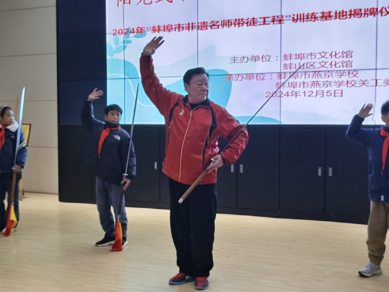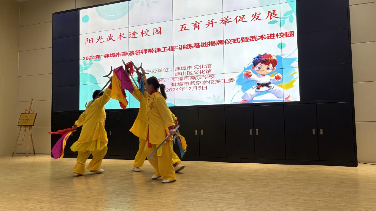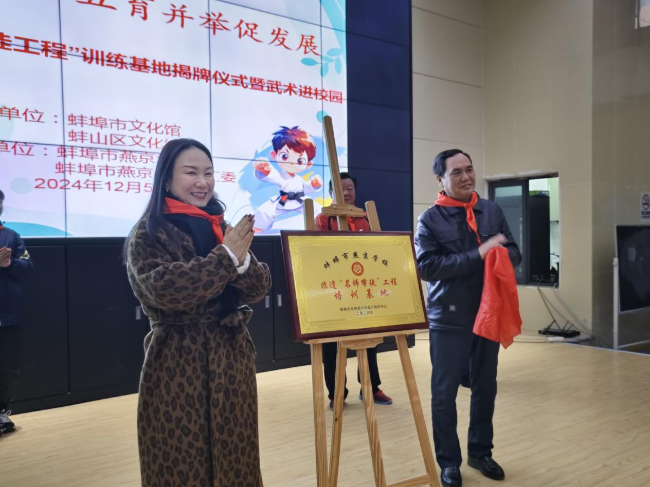 12月5日上午,蚌埠市文化館(市非遺保護中心)走進蚌埠市燕京學校開展非遺“名師帶徒”工程授牌儀式活動,省級非物質文化遺產心意六合拳“武”動校園。市文化館黨支部書記、館長徐祭紅為燕京學校領導現場授牌。