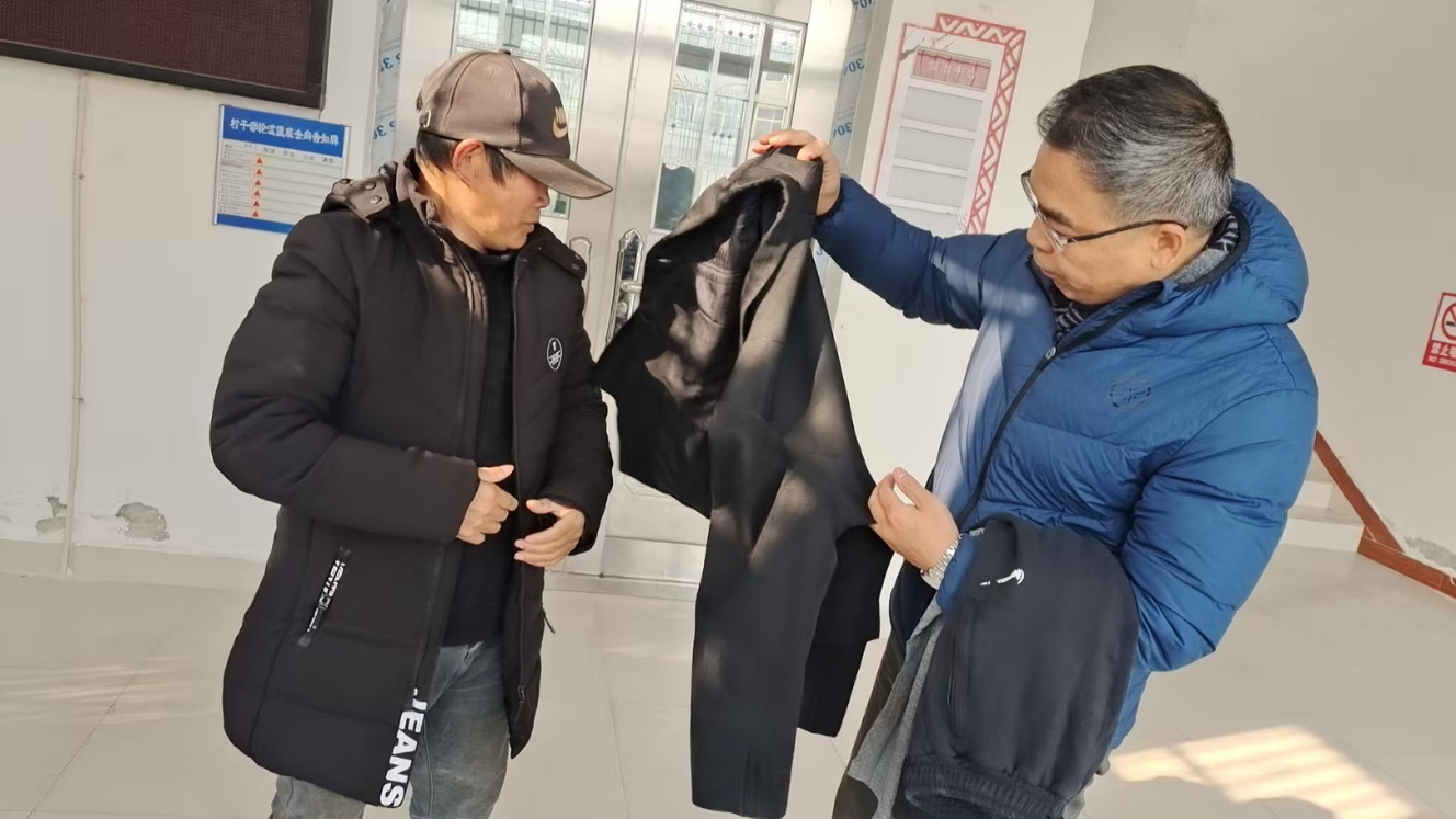 村委會(huì)大廳,駐村干部為五保戶(左)試衣,棉衣穿上很合身。