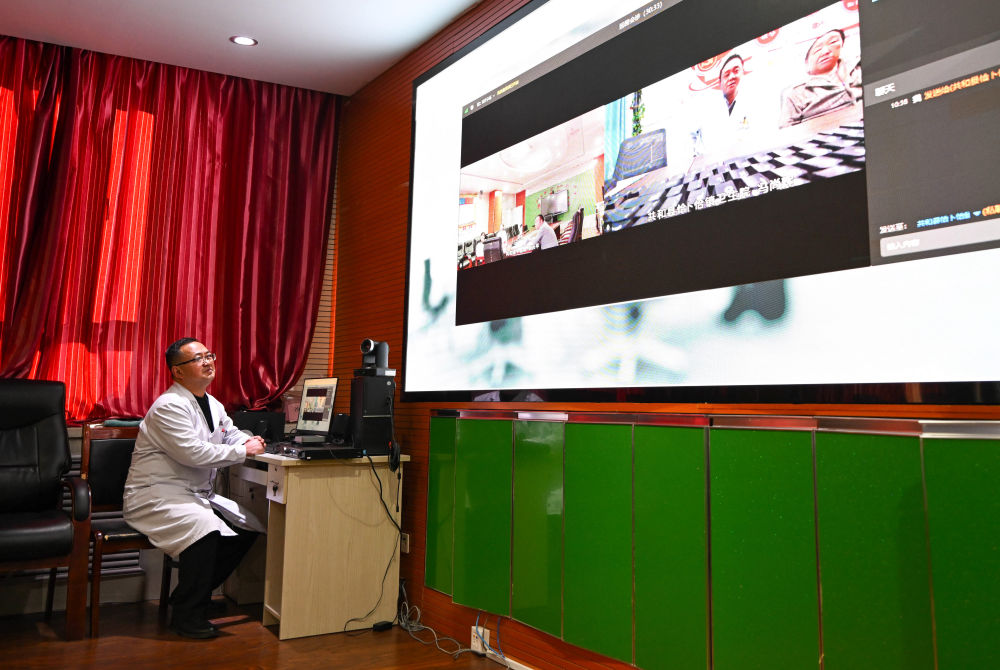 ??2024年12月17日,在青海省海南藏族自治州共和縣中醫院,醫生與鄉鎮衛生院連線進行遠程會診。新華社記者 張龍 攝