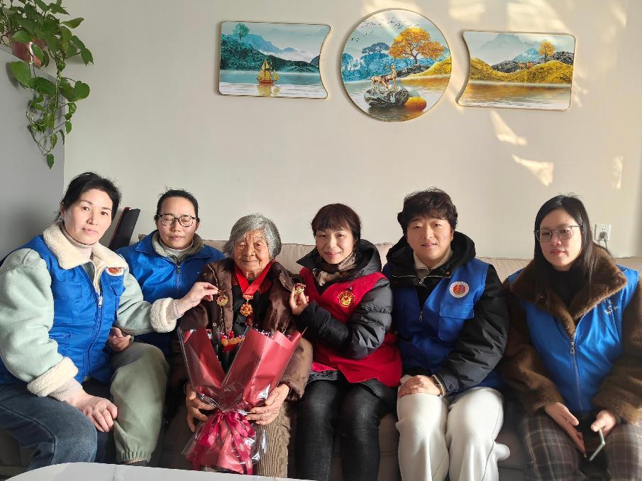 固鎮(zhèn)縣手牽手志愿者協(xié)會(huì)、谷陽(yáng)鎮(zhèn)黃元社區(qū)巾幗志愿者們?yōu)?2歲高齡的全國(guó)“三八紅旗手”王秀蘭送去鮮花和慰問品,聆聽她的故事,傳承她的精神。
