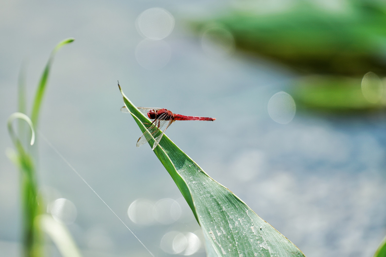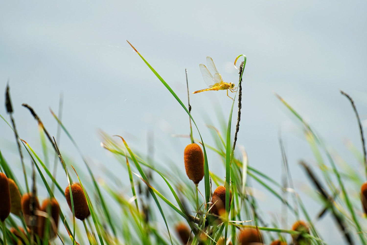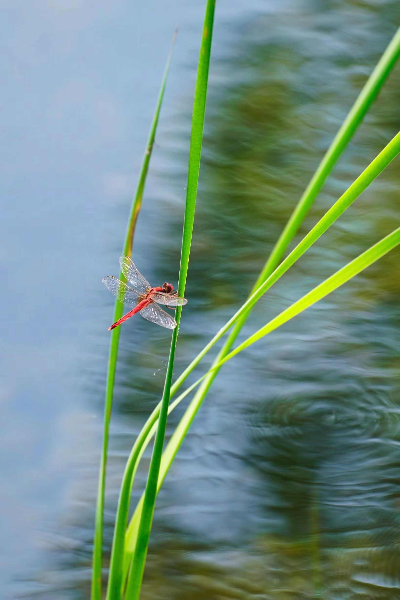 夏天來臨,在安徽省蚌埠市五河縣澮河岸邊的蒲草、蘆葦叢中,各色蜻蜓翩然飛舞,有紅色的、紫色的、絳色的,有的停在草尖上,有的停在蘆葦葉子上,有的在水上飛舞,形成美妙的景象。