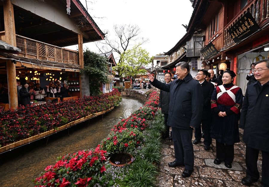 麗江古城有800多年歷史,被列入世界文化遺產名錄。一場春雪過后,麗江游人如織。習近平來到這里,詳細了解古城營建歷史、納西族民居特色和當地文化遺產保護利用、推動文旅融合發展等情況。居民和游客見到總書記十分興奮,爭相問好,有的還彈奏樂器、載歌載舞歡迎總書記。習近平頻頻與大家互動交流,了解商鋪經營狀況和游客感受。他要求當地處理好保護和發展的關系,讓這座美麗的古城煥發新的光彩。
