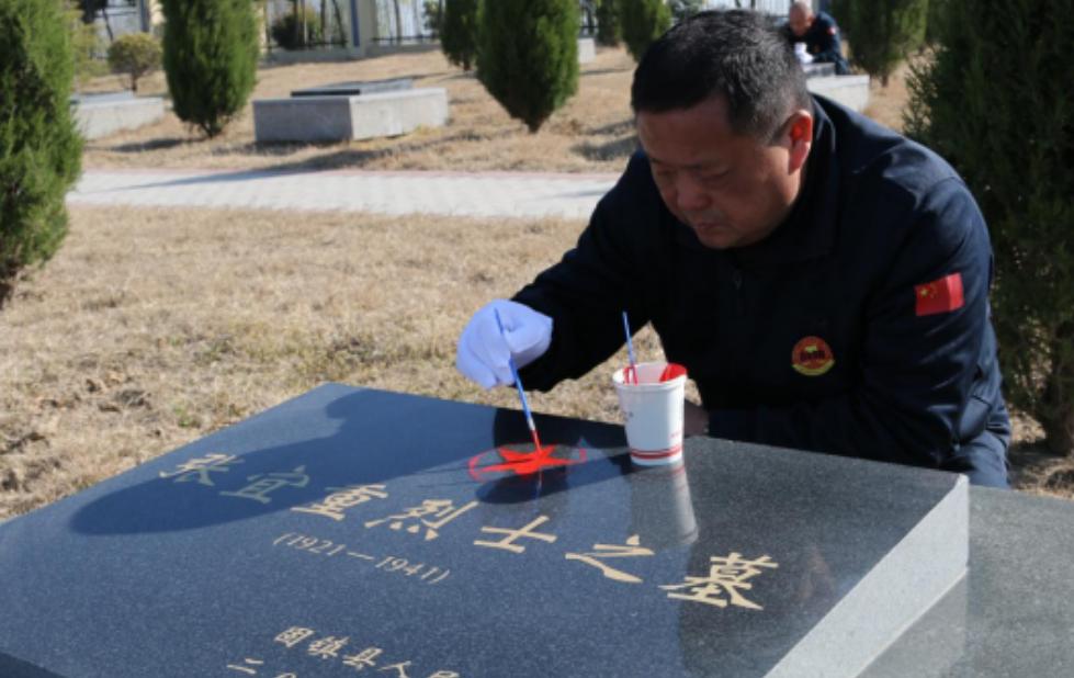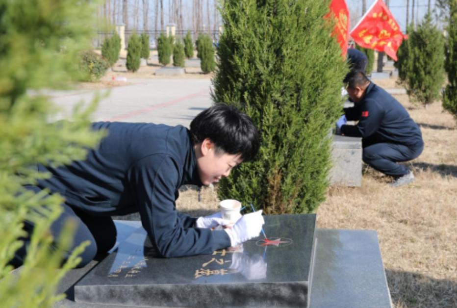 一座墓碑,代表著一位英雄,一排排墓碑,譜寫了可歌可泣的英雄故事。全體人員為長(zhǎng)眠于此的烈士輕輕擦拭墓碑,細(xì)心拂去墓碑上的灰塵,端起顏料,手持畫筆,懷著崇高的敬意,一筆一劃細(xì)心地為每一塊墓碑描上“英烈紅”。