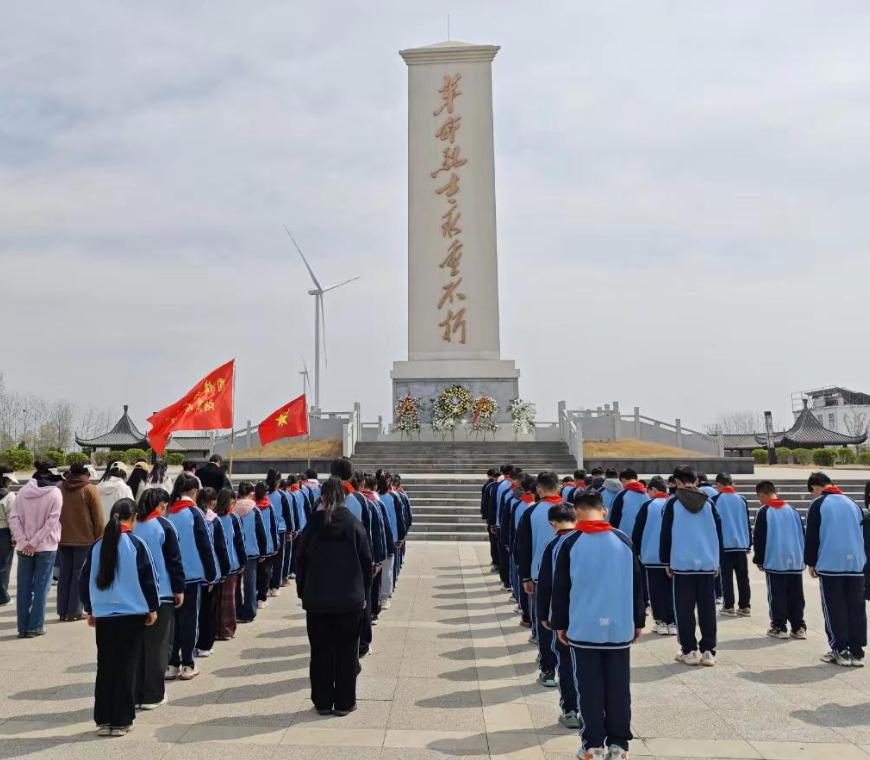 在巍峨的革命烈士紀念碑前,全體師生列隊肅立,禮儀隊學生緩步上前,將象征崇高敬意的花藍敬獻于碑前。全體人員默哀,向為抗日戰爭中英勇獻身的先烈致以最深切的緬懷。隨后,黨員教師重溫入黨誓詞,鏗鏘誓言在陵園上空回蕩;少先隊員代表獻詞,以“銘記烈士遺志,努力學習,奮發圖強”的錚錚誓言表達傳承紅色基因的決心。