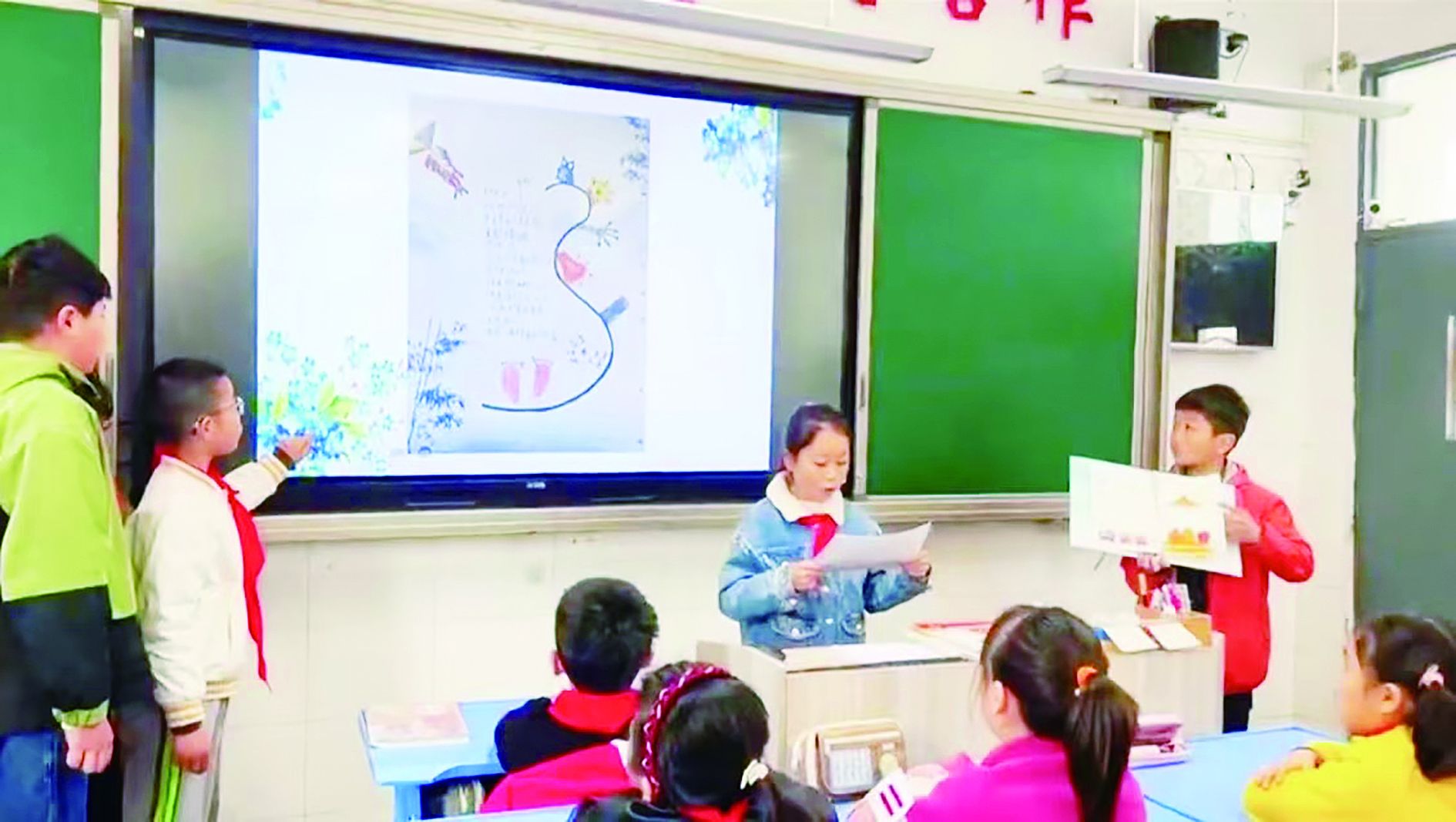 一實(shí)校小學(xué)部四(4)班“輕叩詩歌的大門”主題閱讀課上,學(xué)生們分享閱讀體會(huì)。