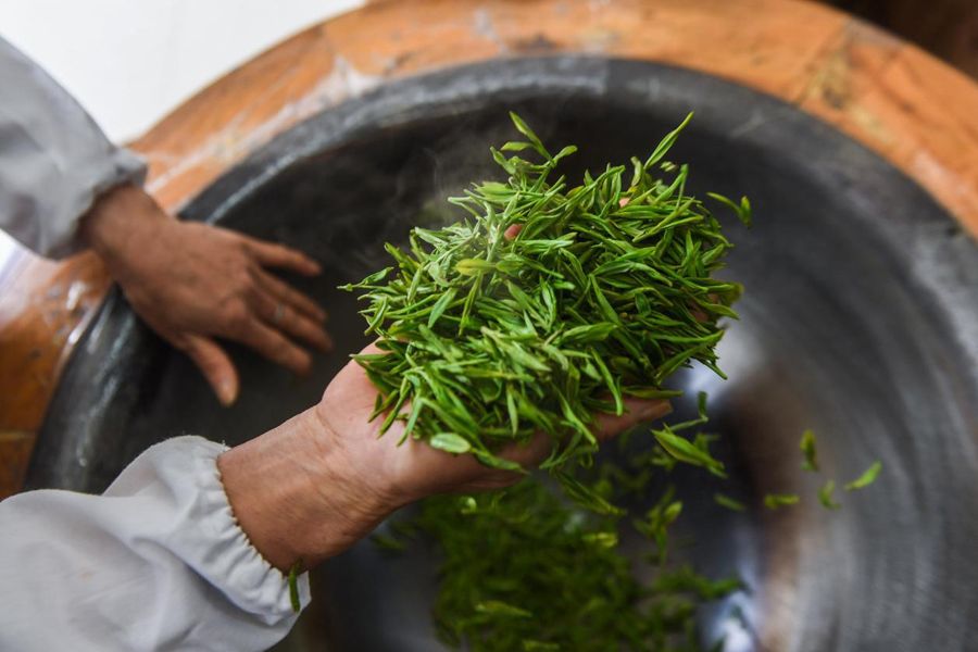 在杭州市西湖風景名勝區滿覺隴村的中國茶葉博物館滿覺隴炒茶中心內,茶農在手工炒制西湖龍井茶。新華社記者 徐昱 攝