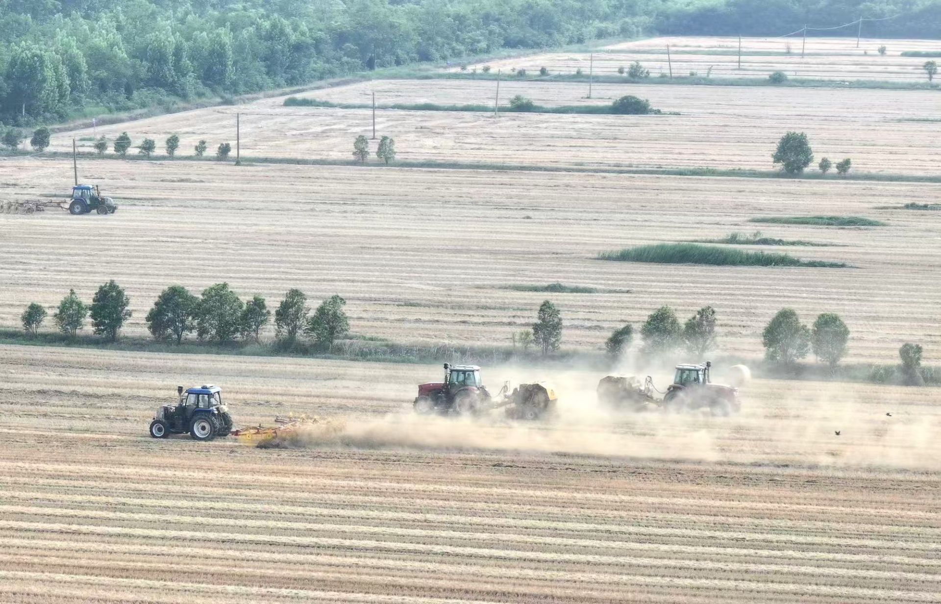 熱浪翻滾、機(jī)車轟鳴。80余臺(tái)打捆機(jī)、摟草機(jī)、叉車、運(yùn)輸卡車等農(nóng)業(yè)機(jī)械設(shè)備,正活躍于安徽省蚌埠市五河縣新集鎮(zhèn)14個(gè)村居,正在有條不紊地開(kāi)展著秸稈離田作業(yè)。