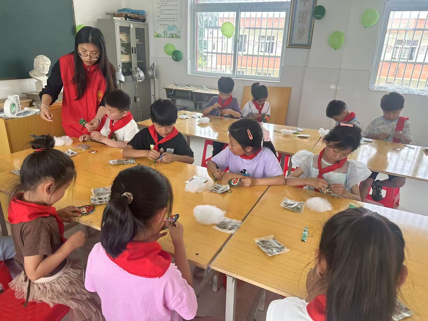 在大李小學一年級班級內,志愿者通過趣味講解與生動圖片,為學生們介紹端午節掛香包習俗。隨后分步示范粽子香包制作過程,通過將分散開來的香包折疊、縫制,到成立體造型,再裝入艾葉、棉花,最后線繩纏繞收口裝飾,形態各異的粽子香包誕生。