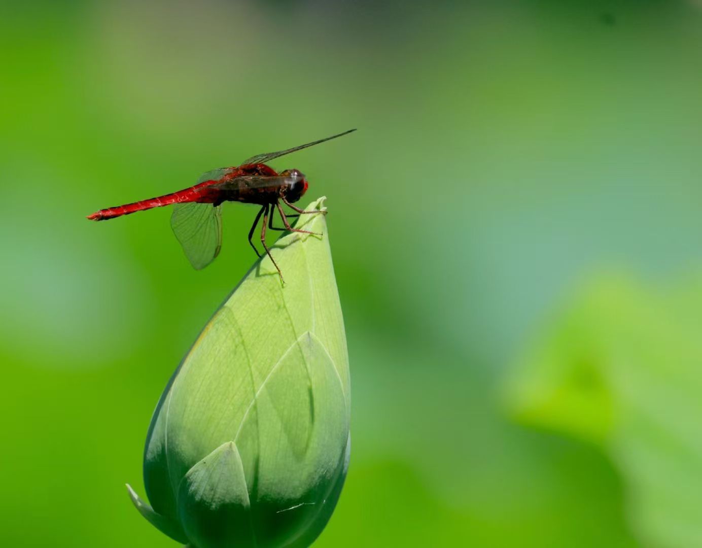近日,微雨欲來(lái)的清晨,在安徽省蚌埠市五河縣西壩口池塘內(nèi),形象地再現(xiàn)了“小荷才露尖尖角,早有蜻蜓立上頭。”的優(yōu)美意境。紅色的蜻蜓與碧綠的荷葉以及將要綻放的荷花構(gòu)成了一幅色彩斑斕的優(yōu)美畫(huà)卷。