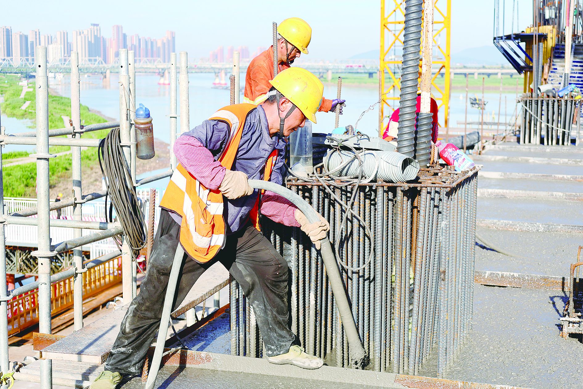 7月2日,延安路淮河大橋及接線工程南岸施工現場,建筑工人正按照施工計劃作業。