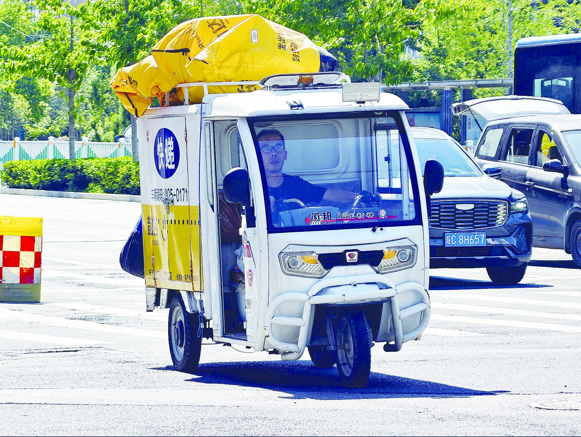 7月3日,一輛快遞三輪行駛在路面上,只為將包裹及時送到客戶手中,用汗水傳遞著便捷,在這炎炎夏日里,勾勒出一道別樣的奮斗風景線。