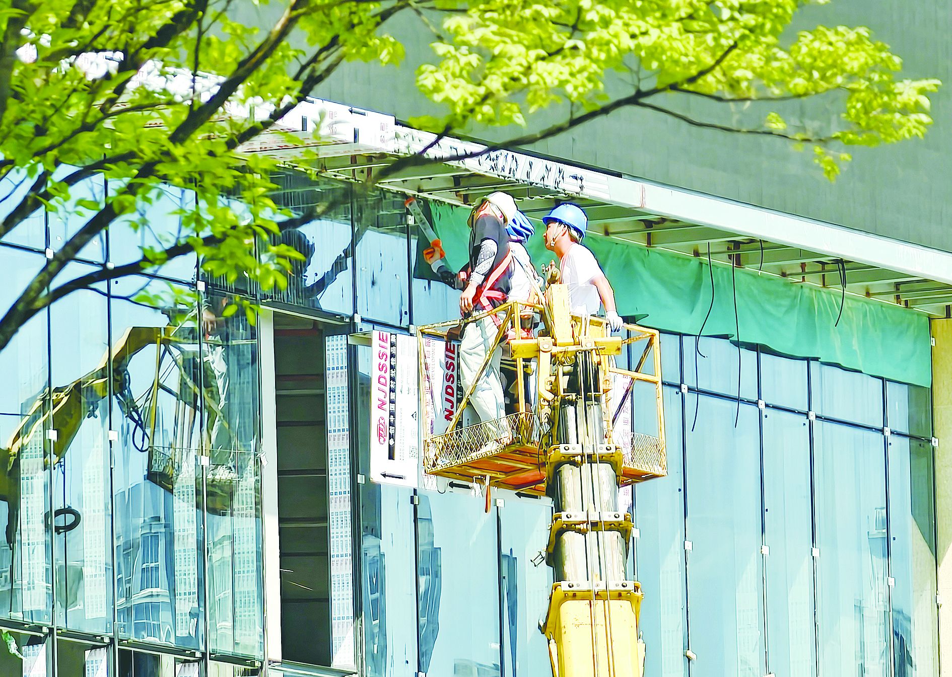 7月3日,延安路一處建筑工地上,幾名建筑工人站在高聳的作業平臺上,專注于手中的工作。高溫下,他們直面“烤”驗,每一個動作都透著堅韌,用汗水澆筑城市的未來,在炎炎夏日中詮釋著勞動的崇高與偉大。