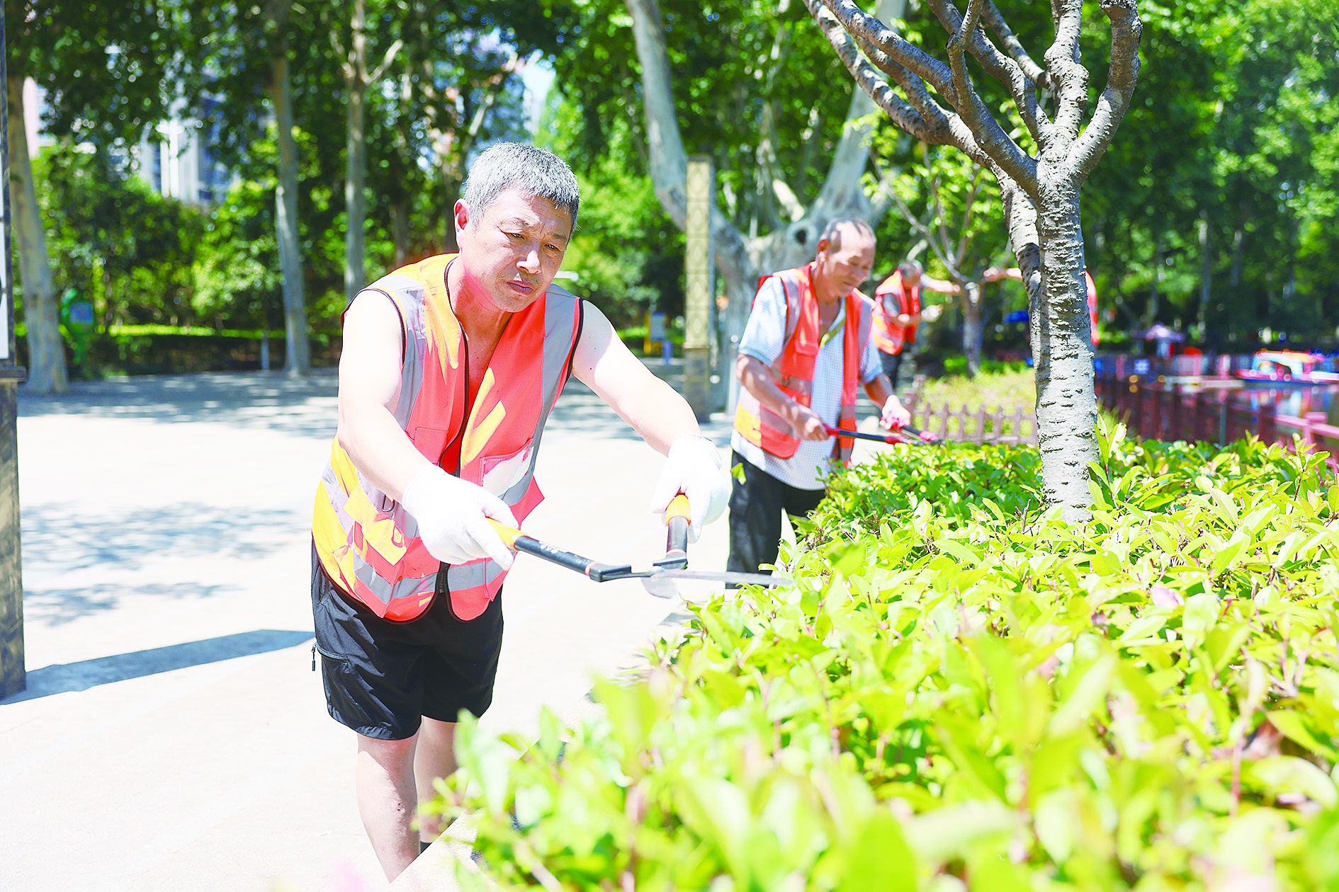 7月3日,津浦大塘公園,園林工人修剪綠植。