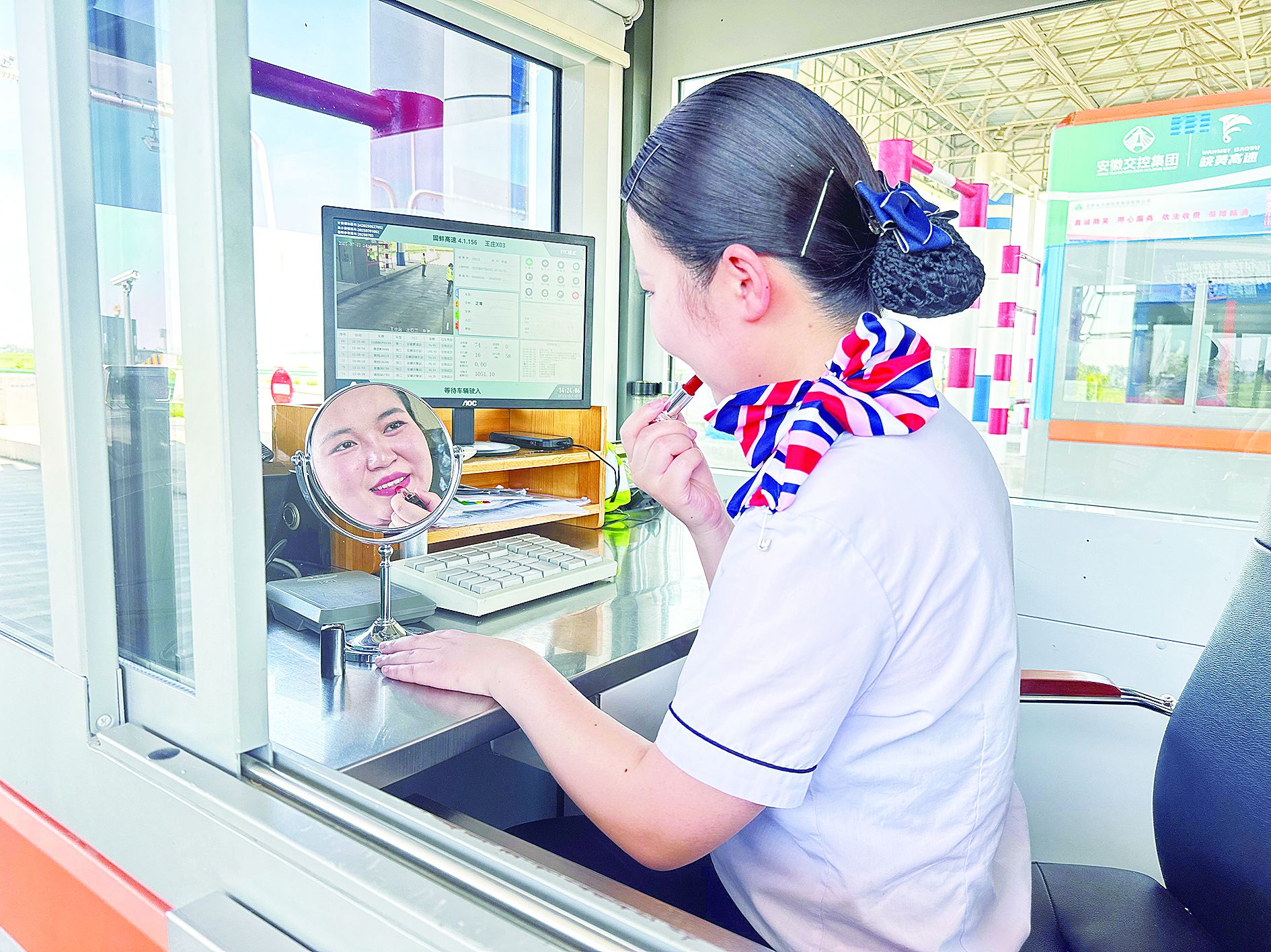 7月3日,蚌固高速王莊收費站,高速收費站收費員王容容堅守崗位。在悶熱的收費亭,她利用間隙對鏡補妝,以最美形象迎八方來客,用堅守與細致,傳遞服務溫度,成烈日下靚麗風景。