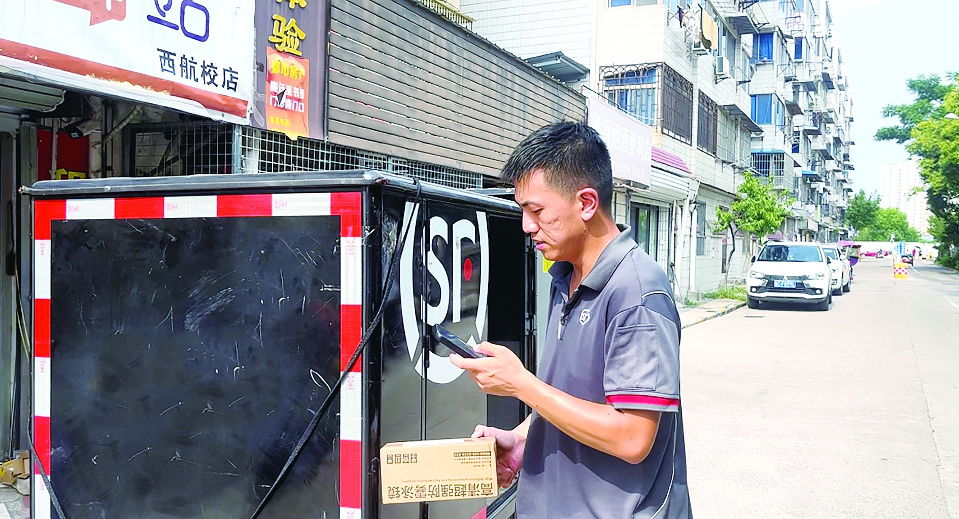 劉超的下一個投遞點是一家商店。商店里開著空調,涼爽的空氣讓他感到一絲舒適。