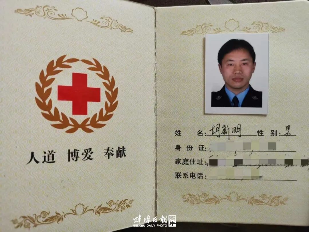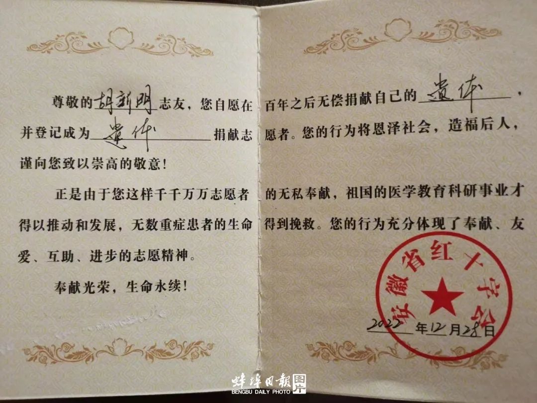 5月11日下午三點(diǎn),劉錦芳遵從胡新明生前遺愿,在紅十字會(huì)、家人、同事的見(jiàn)證下,將他的遺體無(wú)償捐獻(xiàn)給蚌埠醫(yī)學(xué)院,幫他兌現(xiàn)了“在燃盡生命之際做最后一次奉獻(xiàn)”的莊嚴(yán)承諾,用大愛(ài)義舉重新定義生命的意義。生前,胡新明拜托同事找到了獻(xiàn)血證,算是留給妻子的遺產(chǎn)。