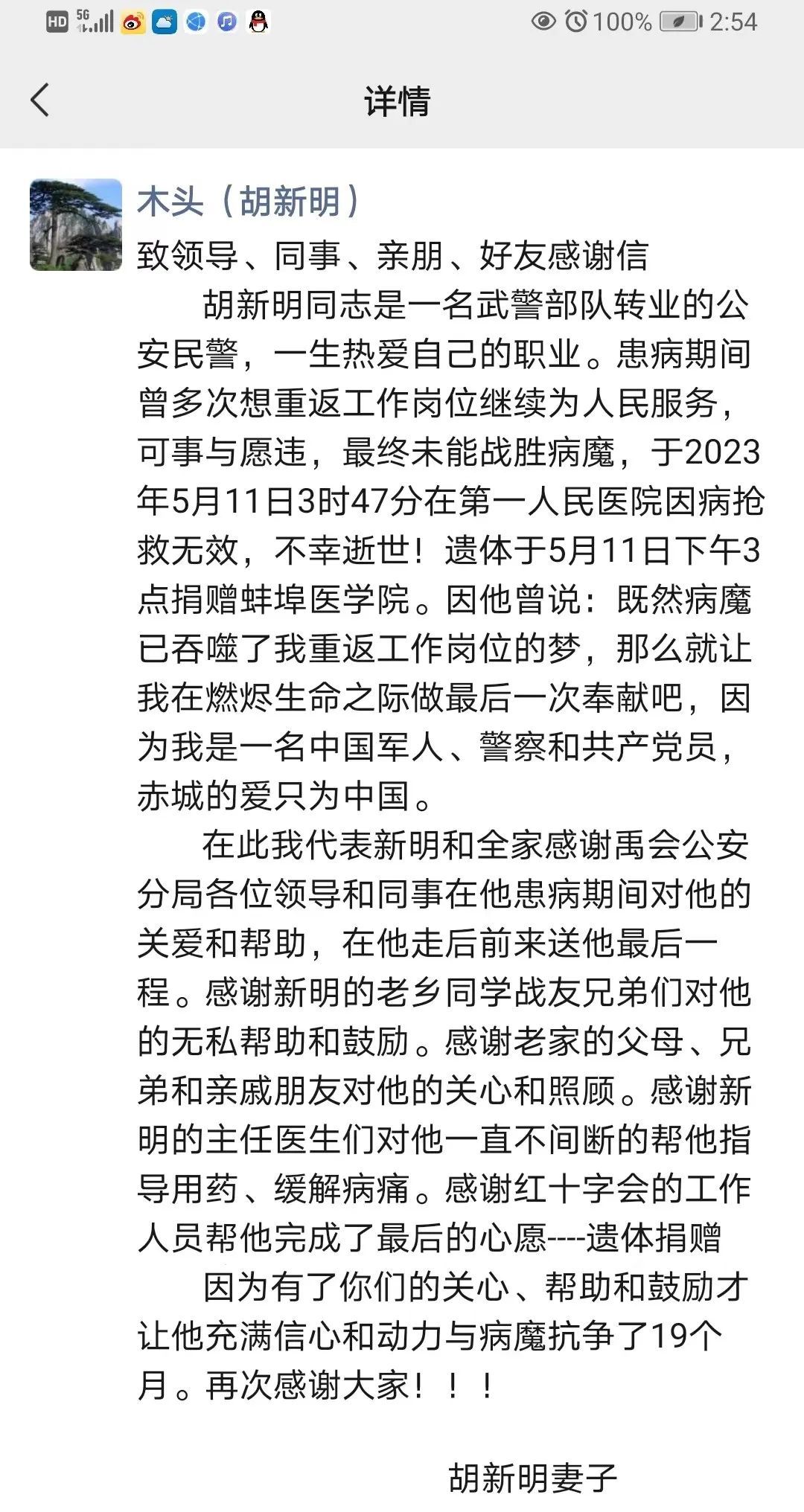 2023年5月11日凌晨3點(diǎn),因病搶救無(wú)效,與疾病抗?fàn)?9個(gè)月后,胡新明的生命永遠(yuǎn)定格在51歲。