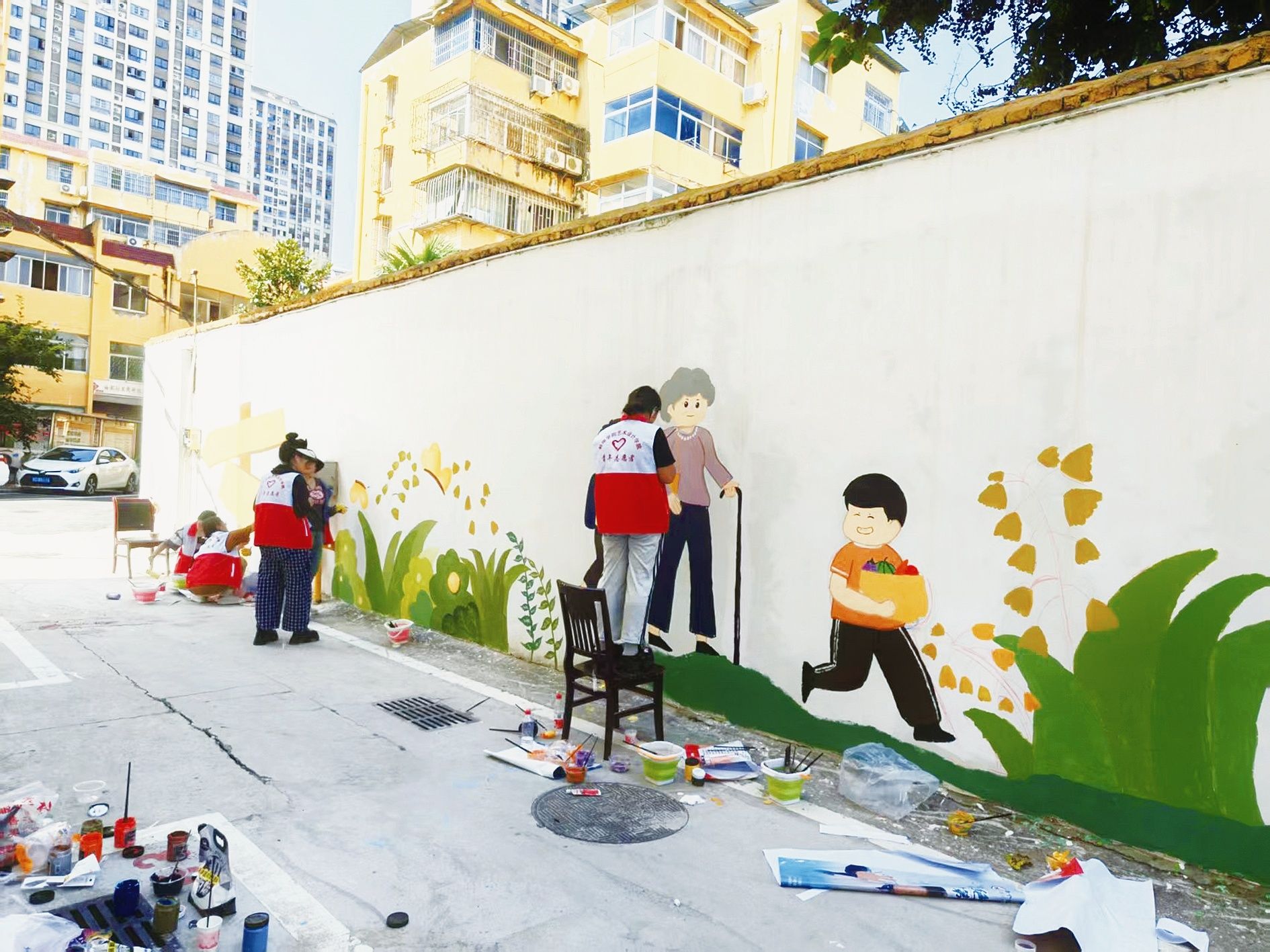 走進物探小區,原本略顯單調的墻面如今“穿”上了五彩“新衣”:畫面里,扎著紅領巾的小朋友正攙扶老人過馬路,青年志愿者們拿著工具清理樓道雜物,垃圾分類點旁的卡通形象正“講解”投放知識……一幅幅生動的手繪作品,配上“鄰里一家親”“海航社區歡迎您 微笑在臉服務在心”等暖心標語,讓抽象的“和諧鄰里”理念變得可觸可感。