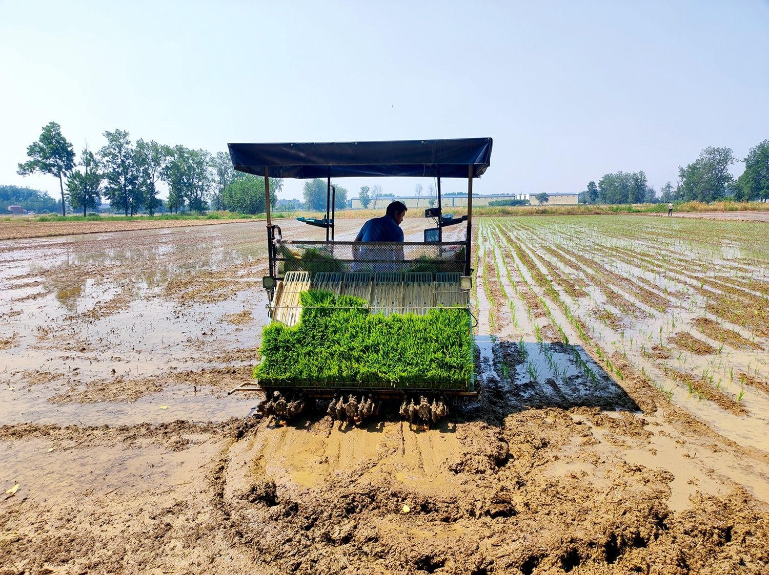 在稻谷之鄉(xiāng)——淮上區(qū)沫河口鎮(zhèn)三鋪村,村民開著插秧機(jī)在田里“遨游”。今年該鎮(zhèn)水稻應(yīng)種面積12多萬畝。預(yù)計6月底全面完成插秧。