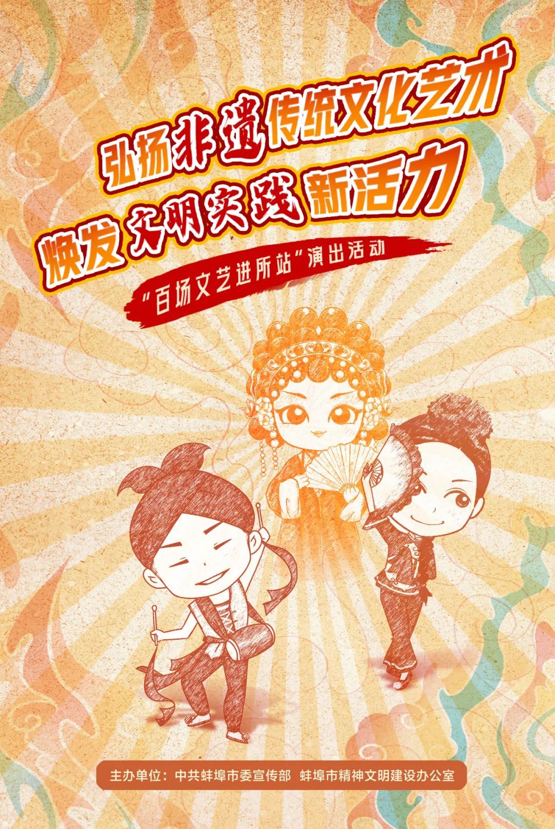 新時(shí)代文明實(shí)踐中心是深入宣傳習(xí)近平新時(shí)代中國(guó)特色社會(huì)主義思想的重要載體,是傳播新思想、弘揚(yáng)新風(fēng)尚、培育新人的綜合平臺(tái)。蚌埠市近年來(lái)全域推進(jìn)新時(shí)代文明實(shí)踐中心建設(shè),全市共建成7個(gè)縣區(qū)新時(shí)代文明實(shí)踐中心、75個(gè)鄉(xiāng)鎮(zhèn)街道新時(shí)代文明實(shí)踐所、1094個(gè)村居社區(qū)新時(shí)代文明實(shí)踐站,實(shí)現(xiàn)文明實(shí)踐陣地全覆蓋!一個(gè)個(gè)標(biāo)識(shí)統(tǒng)一、功能完善的實(shí)踐陣地,成為城鄉(xiāng)最亮麗的文明地標(biāo)。為進(jìn)一步發(fā)揮新時(shí)代文明實(shí)踐陣地宣傳群眾、教育群眾、關(guān)心群眾、服務(wù)群眾的積極作用,不斷豐富群眾文化生活,中共蚌埠市委宣傳部、市精神文明建設(shè)辦公室精心策劃了“百場(chǎng)文藝進(jìn)所站”演出活動(dòng),組織專業(yè)戲劇歌舞團(tuán)隊(duì),把優(yōu)秀的文藝節(jié)目送到群眾身邊的文明實(shí)踐陣地,用群眾喜聞樂(lè)見(jiàn)的藝術(shù)形式,傳遞黨的聲音,講述蚌埠故事,讓新時(shí)代文明實(shí)踐的種子在珠城大地上開(kāi)花結(jié)果。
