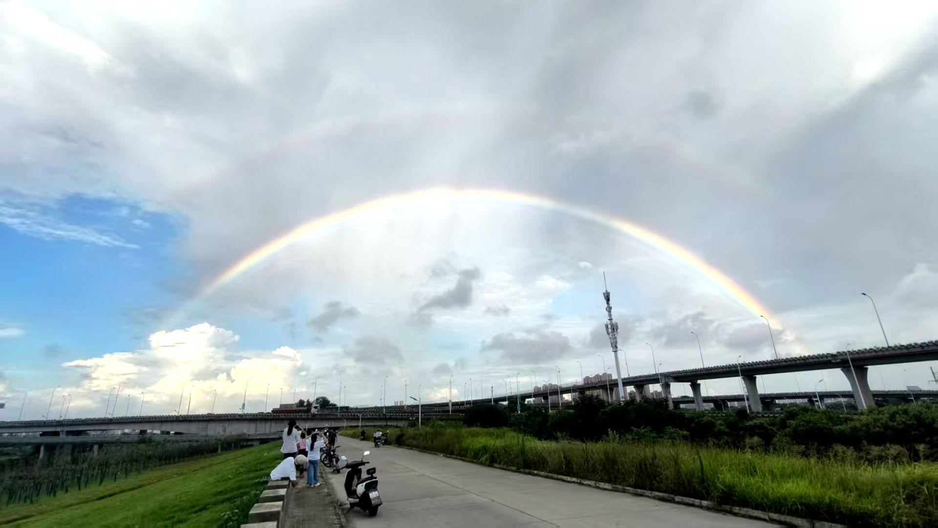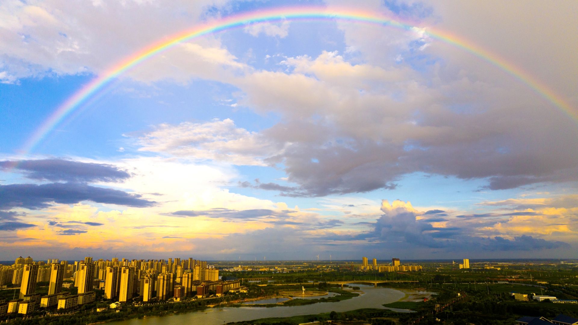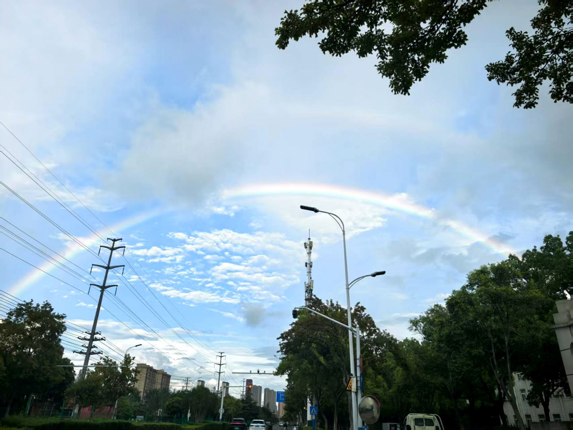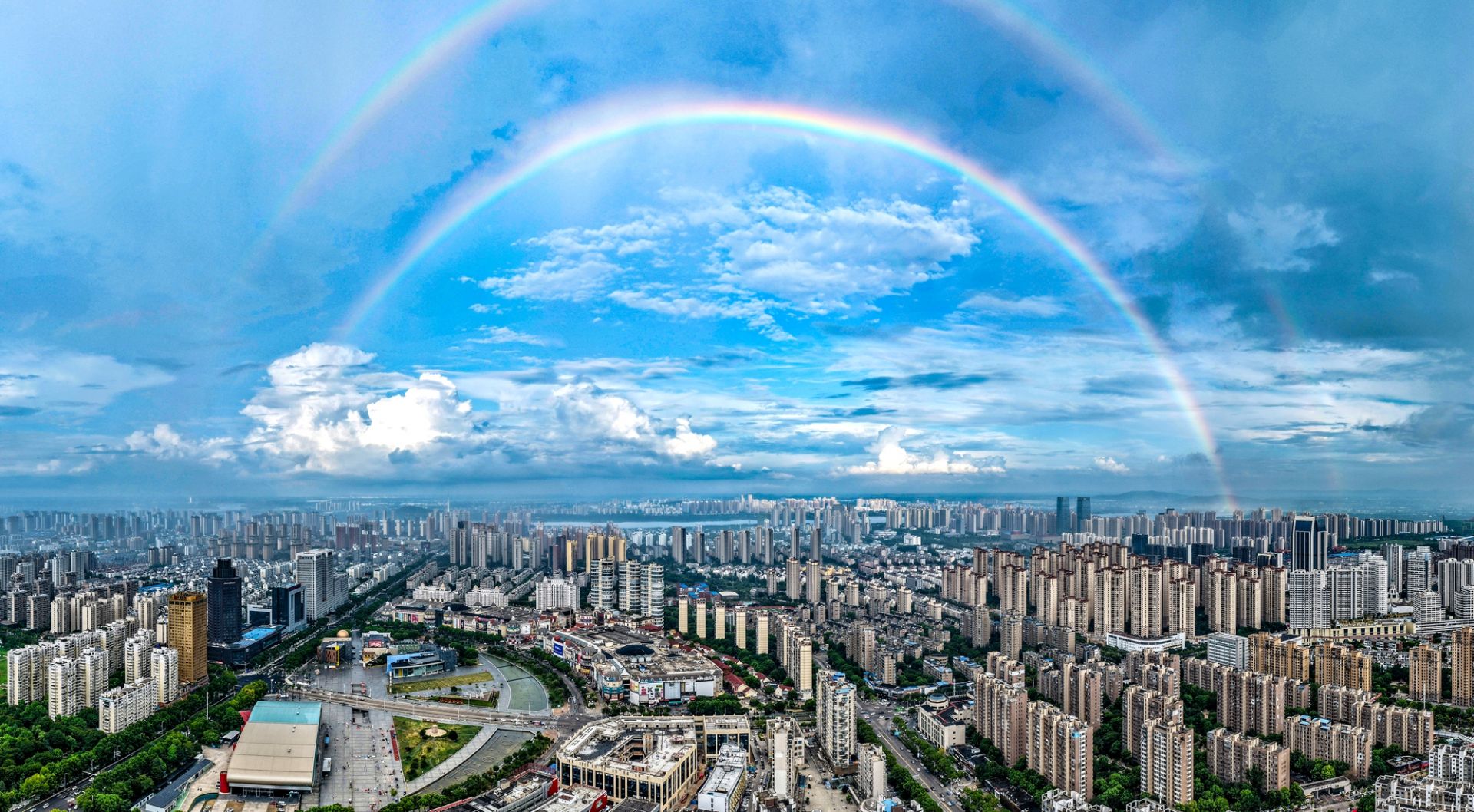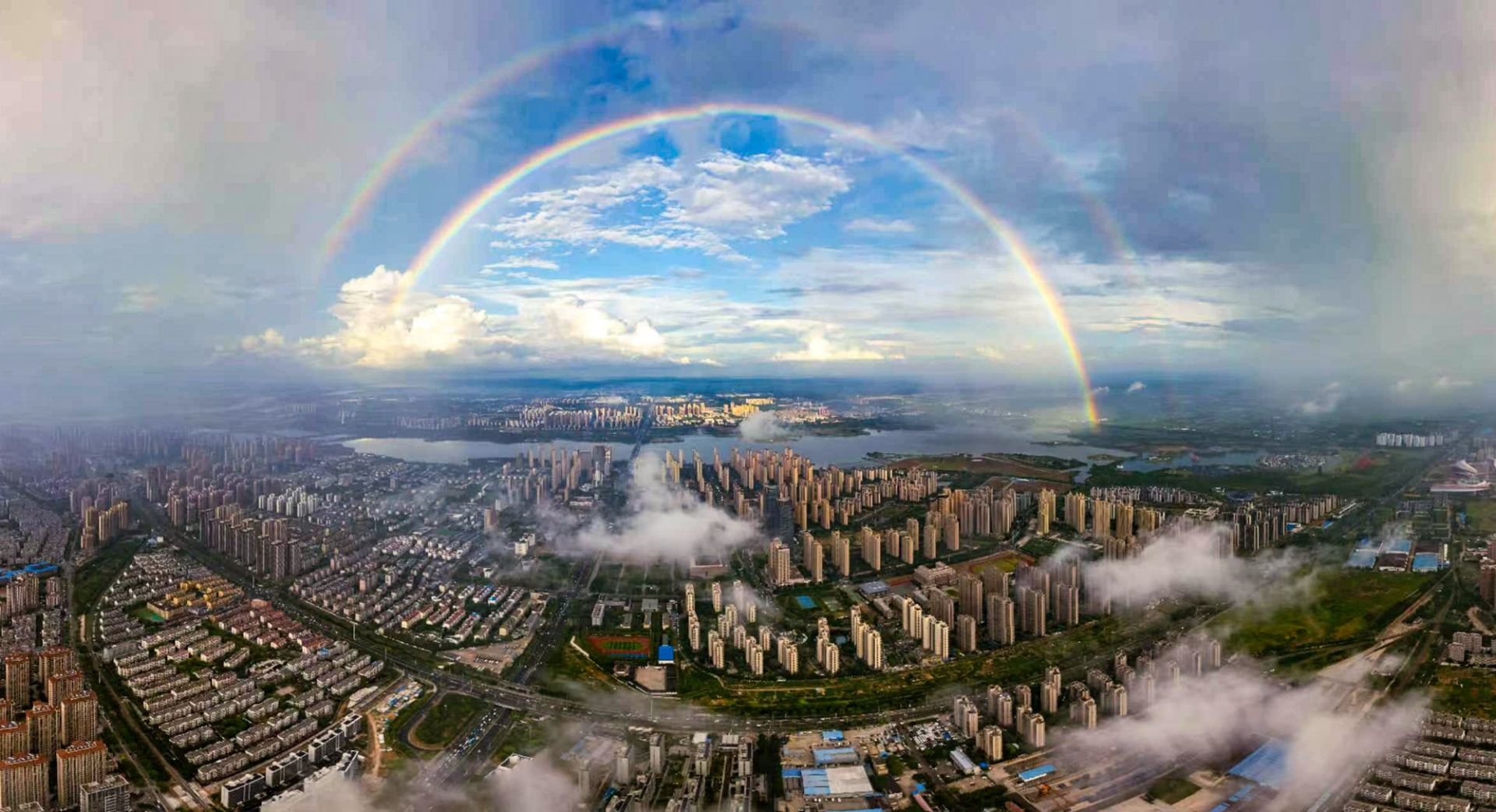 7 月 28 日下午,安徽省蚌埠市一場驟雨過后,天空豁然放晴。剎那間,兩道彩虹并肩躍出云層,在珠城上空架起雙層七彩拱門,上層如淡彩暈染,下層似濃墨重彩,光影流轉間,將湖岸的綠意、粼粼波光與城市輪廓暈染成畫。這難得一見的奇景,被蚌埠市民敏銳捕捉。無論是湖畔漫步時的即興抓拍,還是聞訊趕來的專程守候,大家紛紛拿起相機、手機、無人機,用鏡頭定格下雙虹橫跨珠城的每一刻。這場不期而遇的絢爛,是夏日饋贈蚌埠的浪漫,更是市民眼中最動人的瞬間。