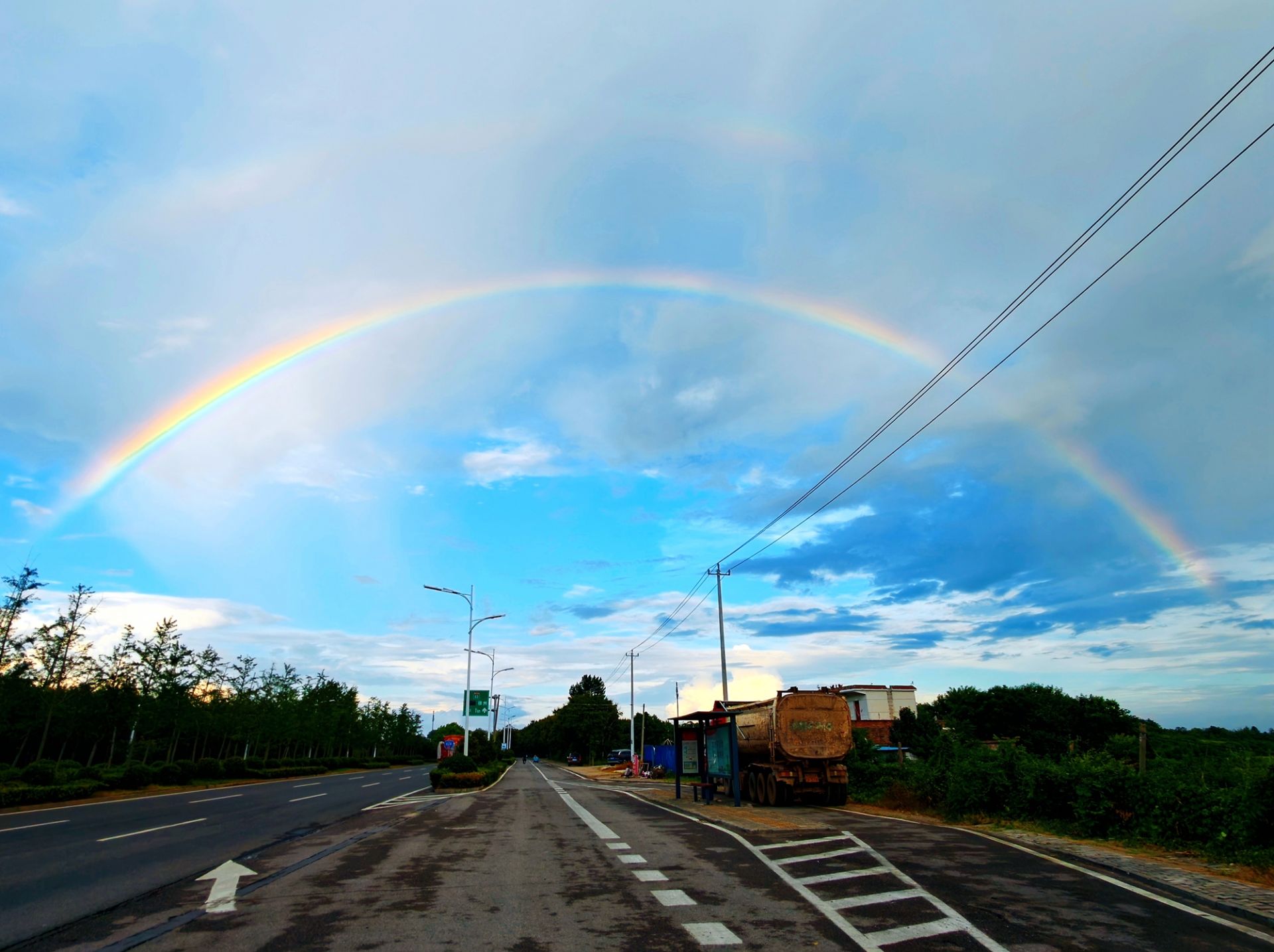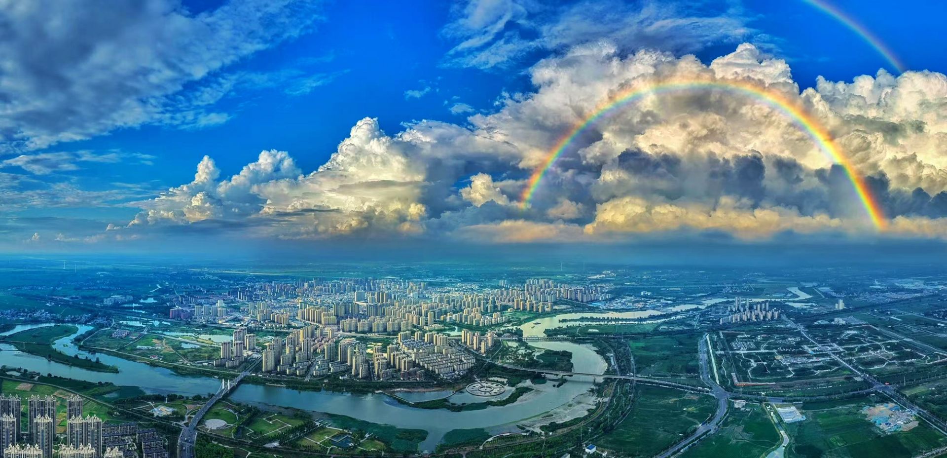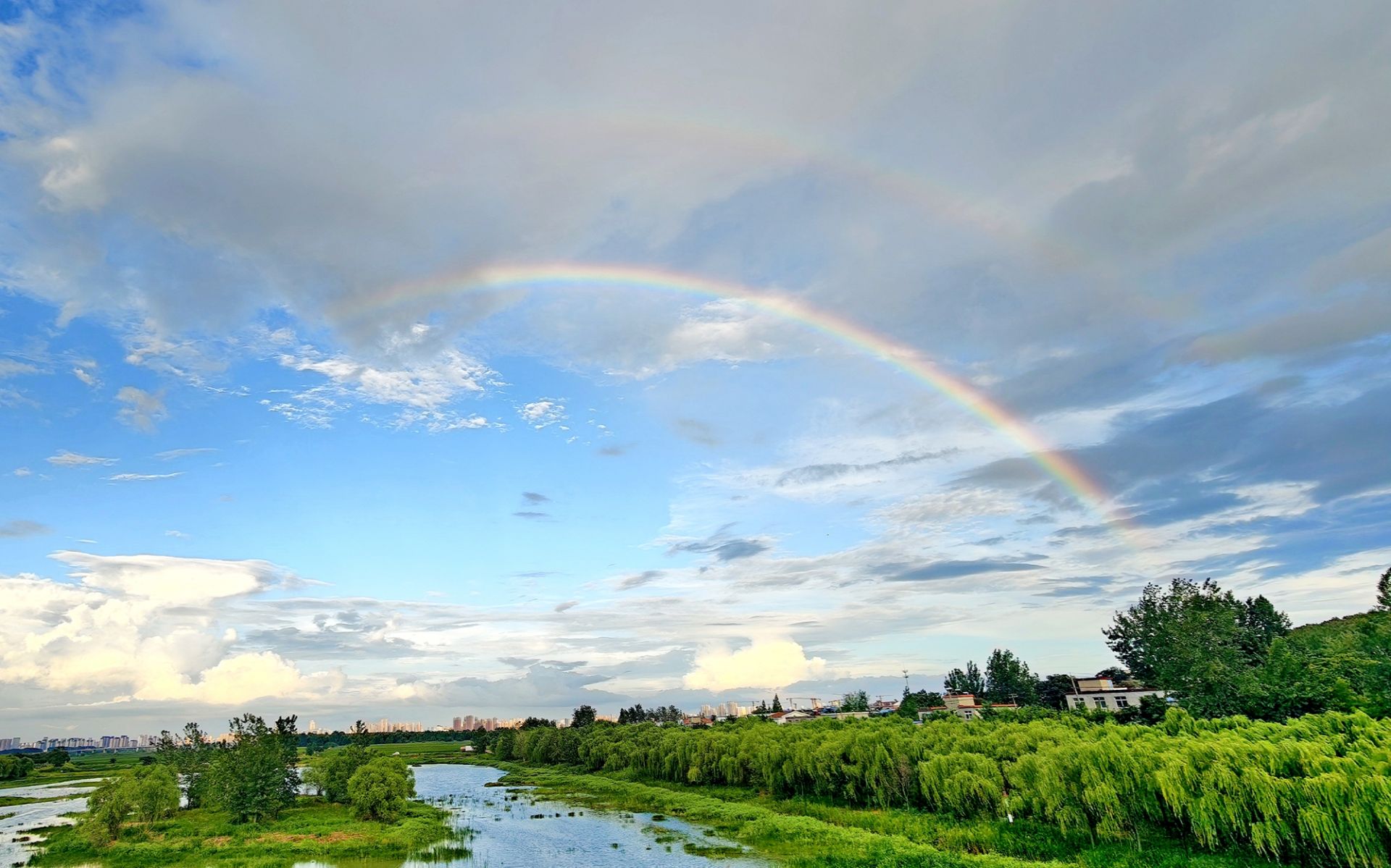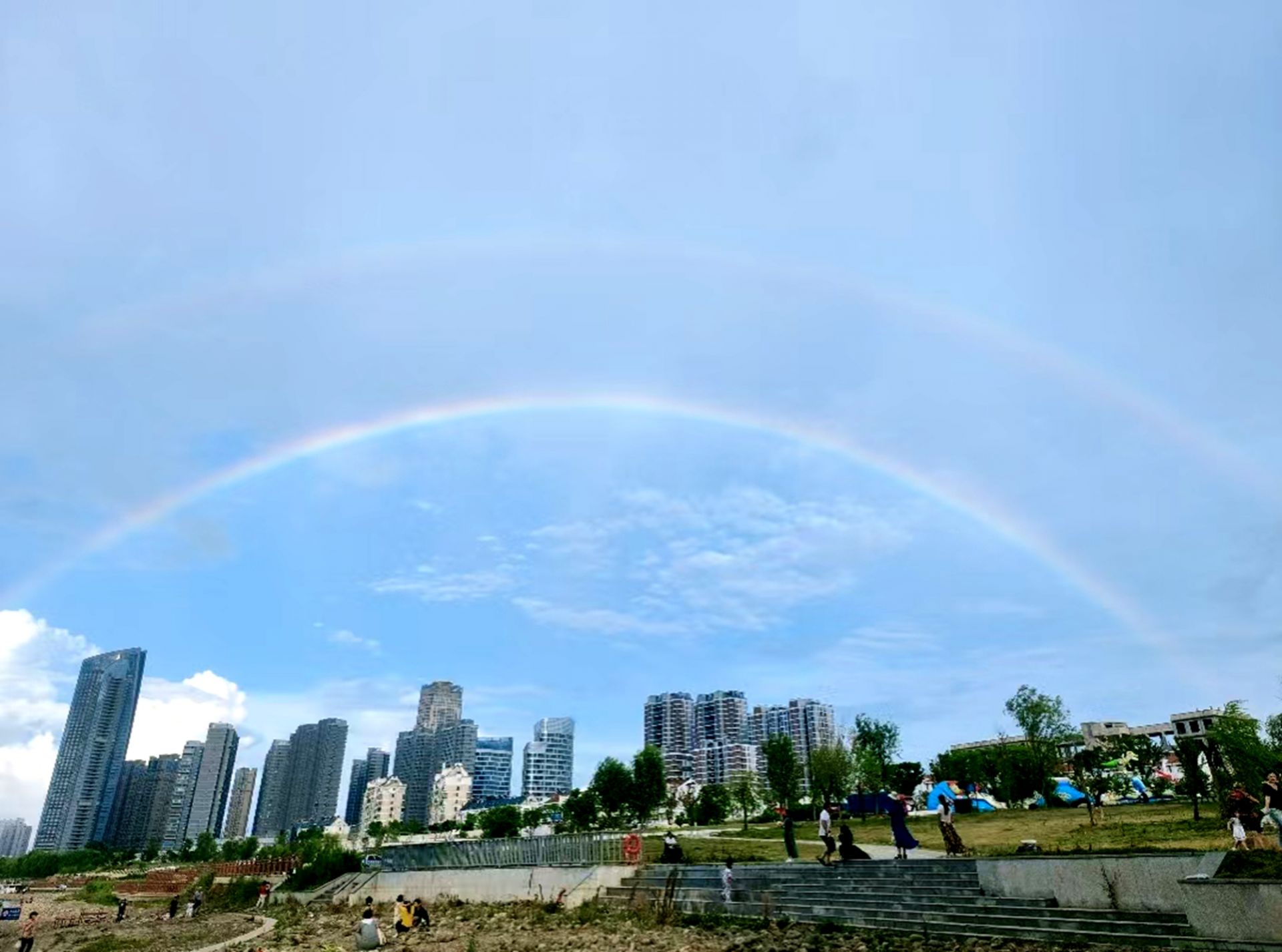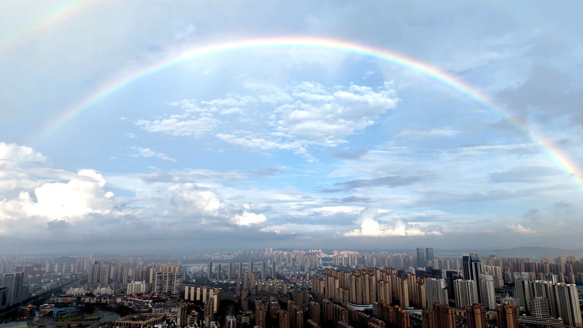 7 月 28 日下午,安徽省蚌埠市一場驟雨過后,天空豁然放晴。剎那間,兩道彩虹并肩躍出云層,在珠城上空架起雙層七彩拱門,上層如淡彩暈染,下層似濃墨重彩,光影流轉間,將湖岸的綠意、粼粼波光與城市輪廓暈染成畫。這難得一見的奇景,被蚌埠市民敏銳捕捉。無論是湖畔漫步時的即興抓拍,還是聞訊趕來的專程守候,大家紛紛拿起相機、手機、無人機,用鏡頭定格下雙虹橫跨珠城的每一刻。這場不期而遇的絢爛,是夏日饋贈蚌埠的浪漫,更是市民眼中最動人的瞬間。