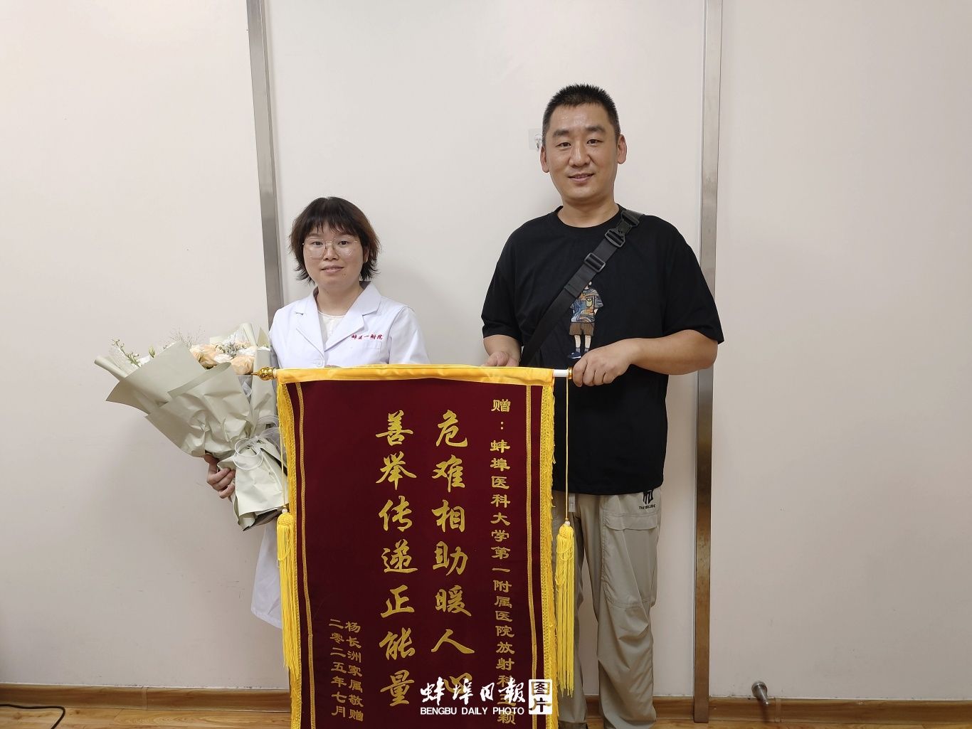 7月27日,一面寫著 “危難相助暖人心,善舉傳遞正能量” 的錦旗,送到了蚌埠醫(yī)科大學(xué)第一附屬醫(yī)院放射科王穎手中。這面遲到52天的感謝,背后藏著一段發(fā)生在初夏的暖心故事。