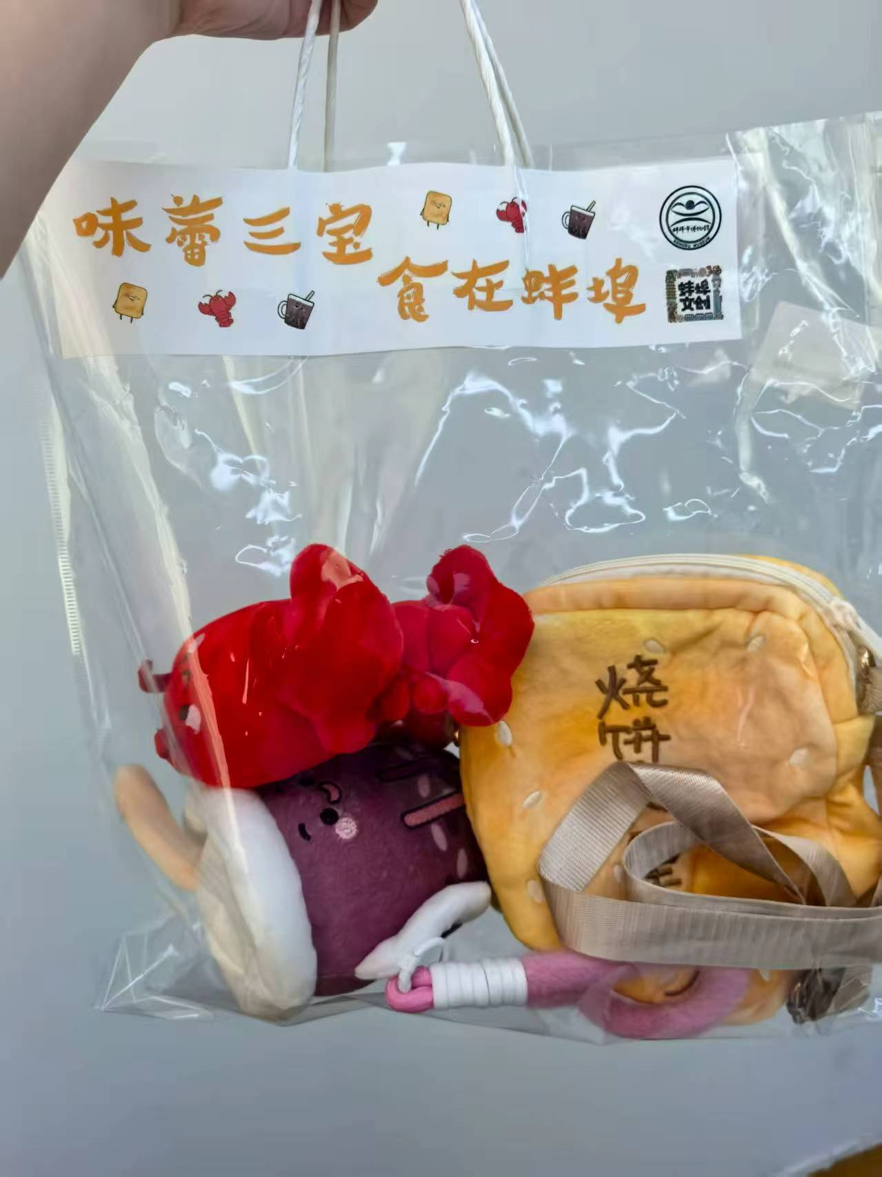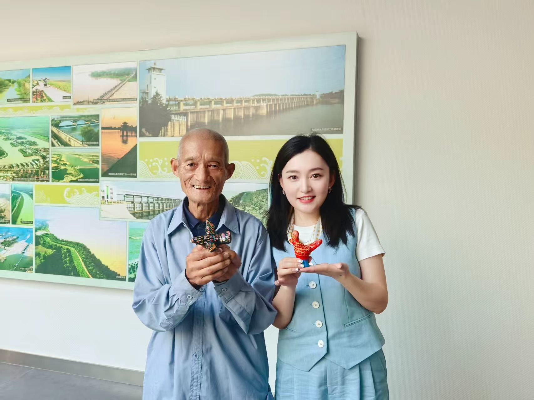 在淮濱縣淮河博物館,蚌埠日報記者把“千里走淮河 一起拆盲盒”的禮物——“皖C三件套”玩偶傳遞給鄭鎮江。老爺子十分高興:“我要把蚌埠的禮物送給小孫女,以后有機會帶她去蚌埠玩!”(李揚)