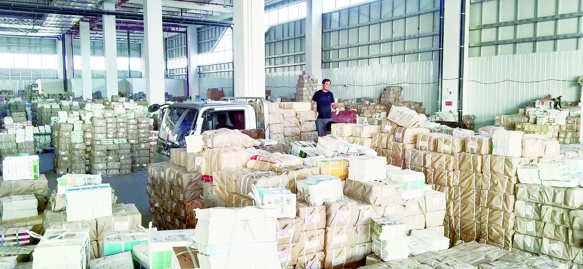 位于龍子湖區(qū)高新電子產業(yè)園的蚌埠新華書店教材倉庫里,工作人員正在對入庫新教材進行搬運,即將送去校園。據市新華書店教育運營部經理周杰介紹,包含三縣在內,全市新書總冊數約950萬冊,目前正在進行“送書到校”工作,確保在開學前,圓滿完成“送書到校、課前到書”任務。(周芳林)
