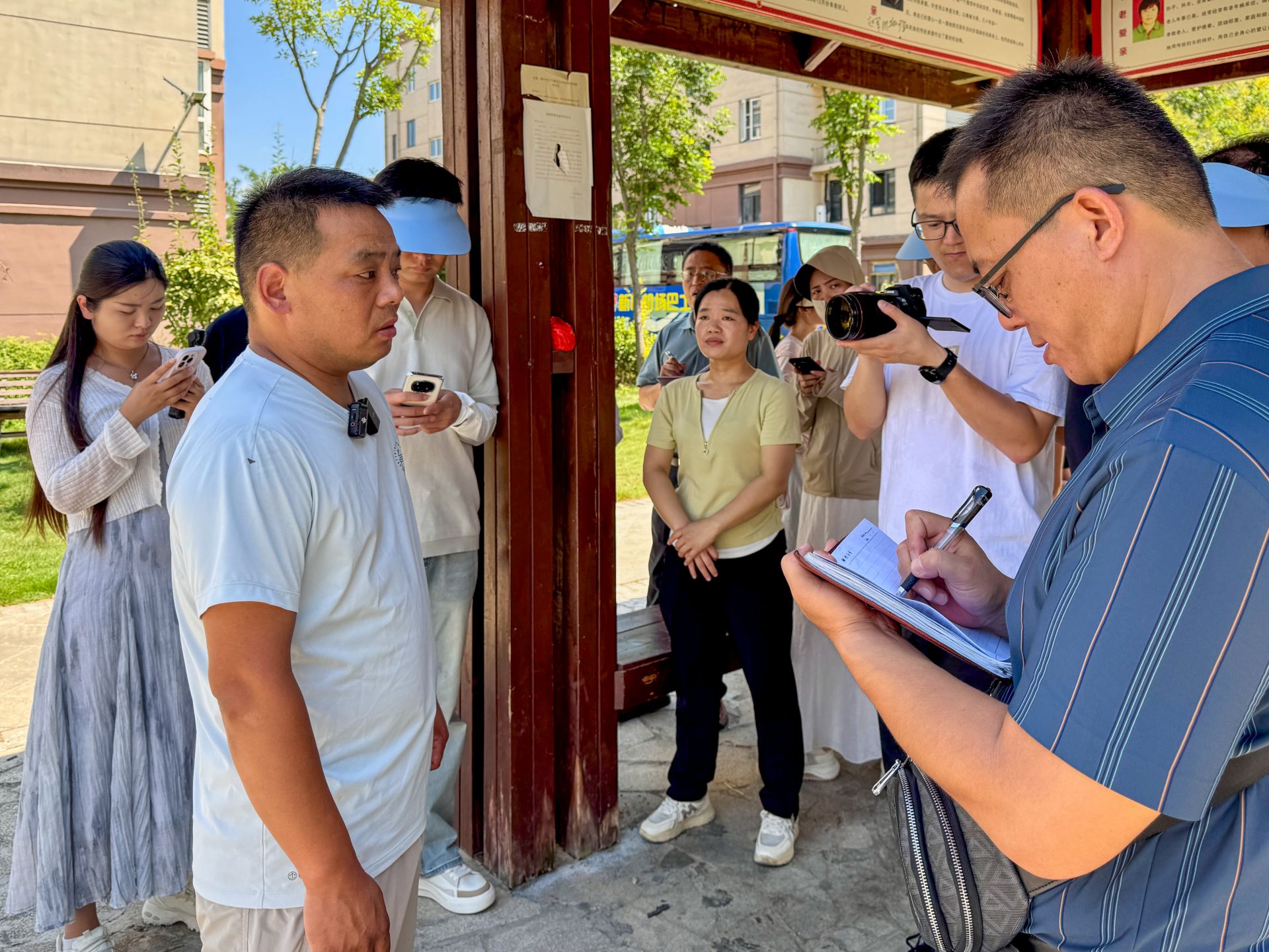 8月27日下午,2025年“千里淮河今安瀾·行走淮河”網絡主題宣傳活動采訪團一行來到阜陽市阜南縣王家壩鎮淮上社區、曹集鎮利民村西田坡莊臺采訪。(尤靖文)