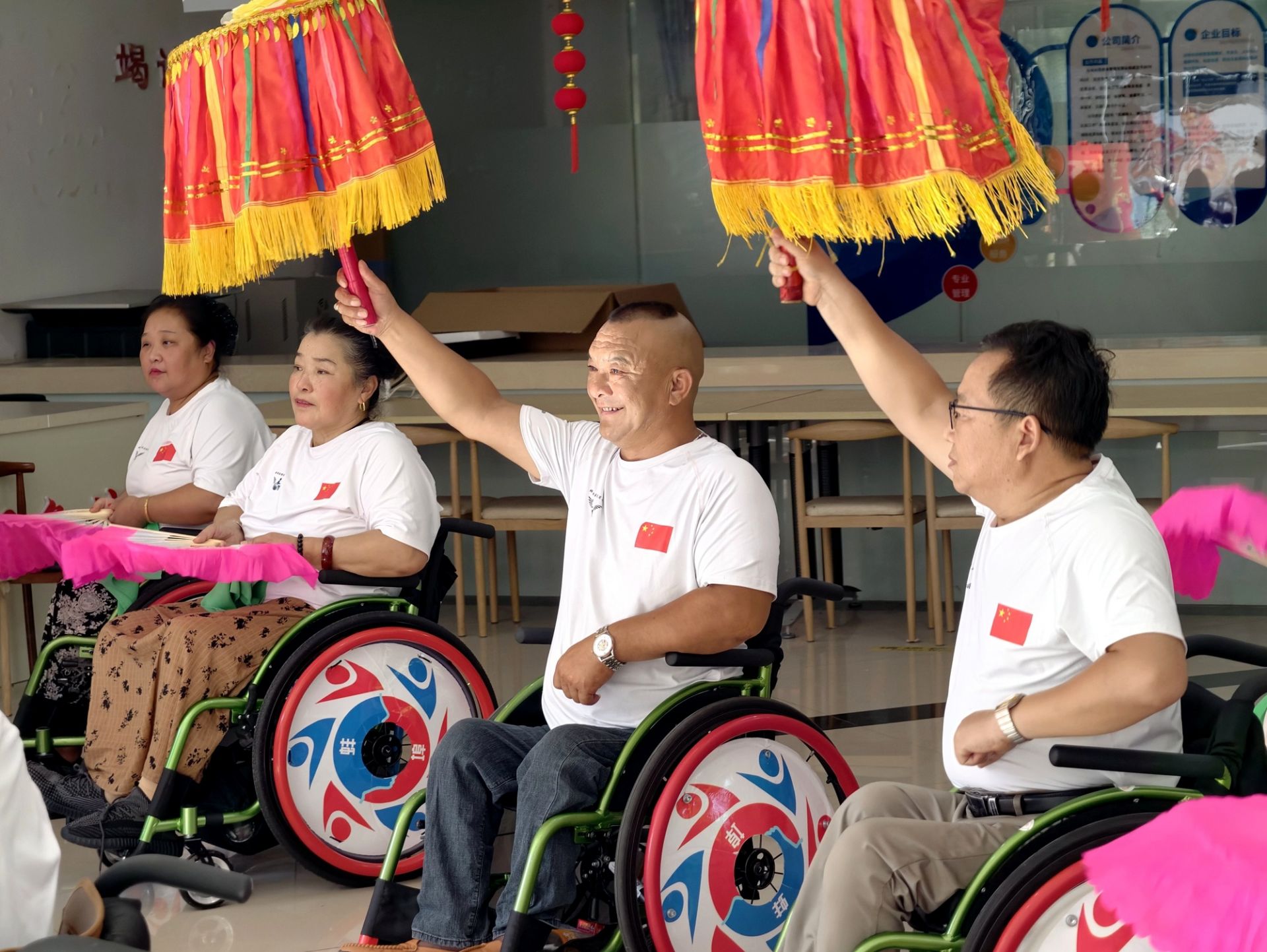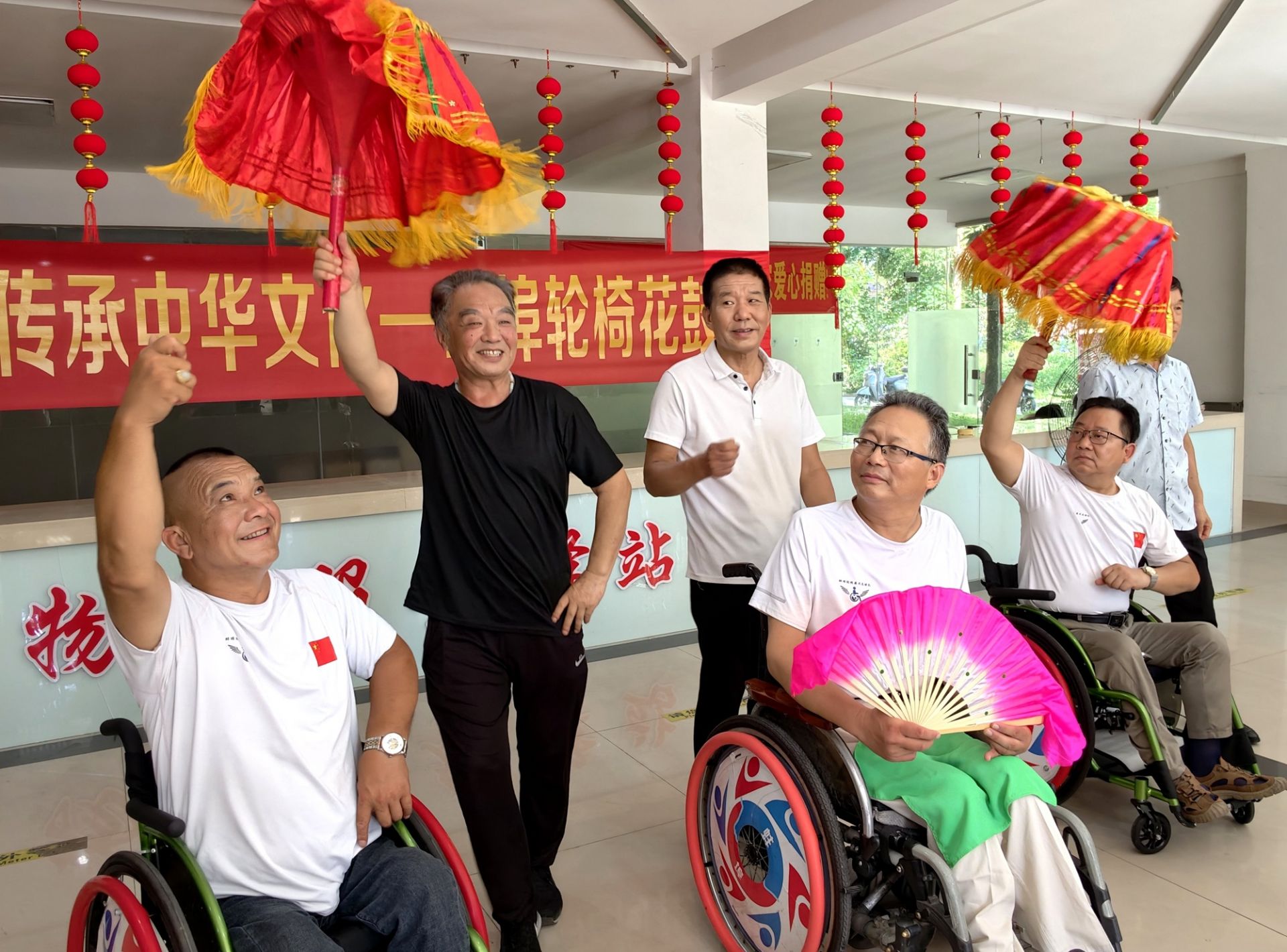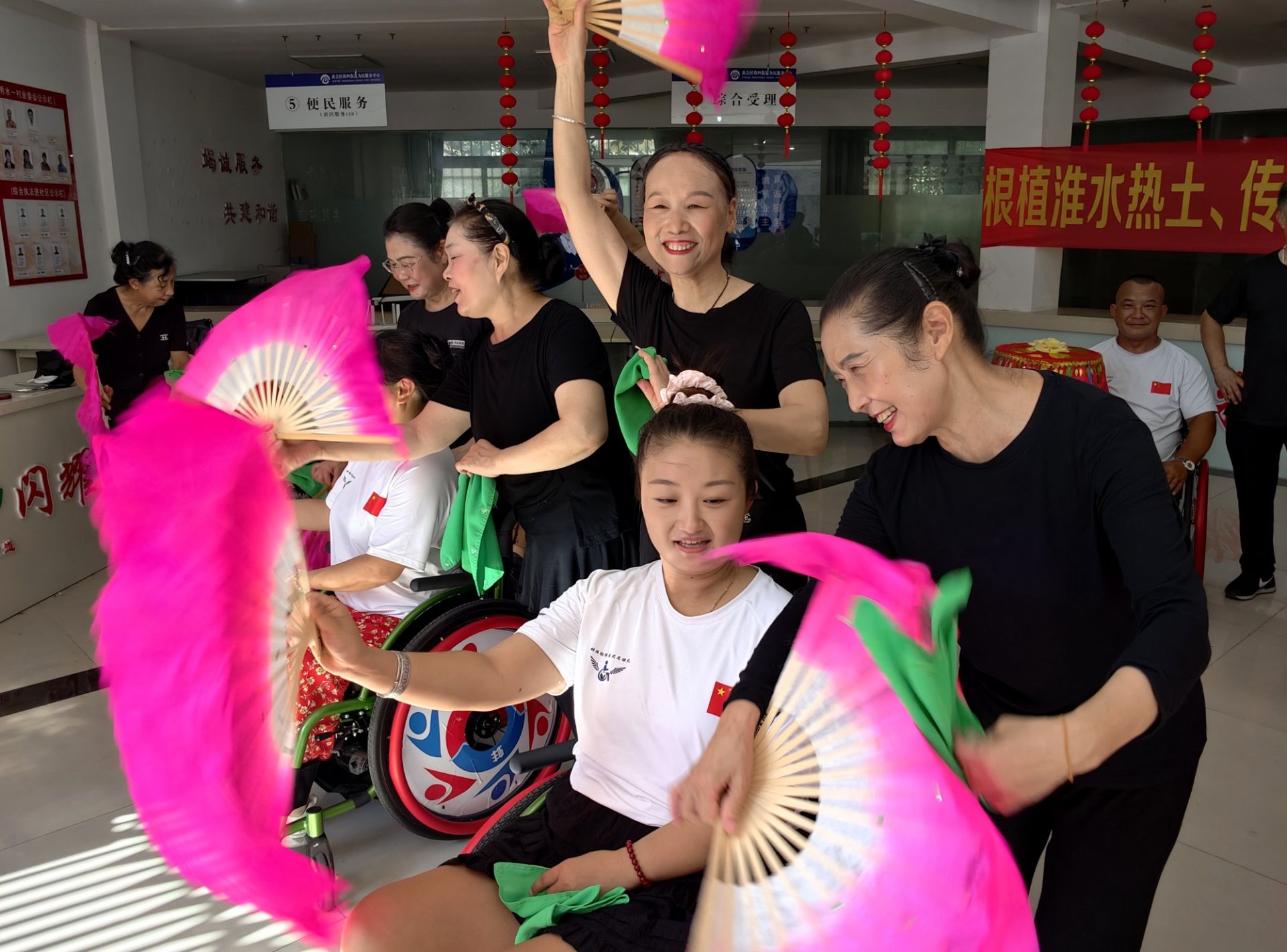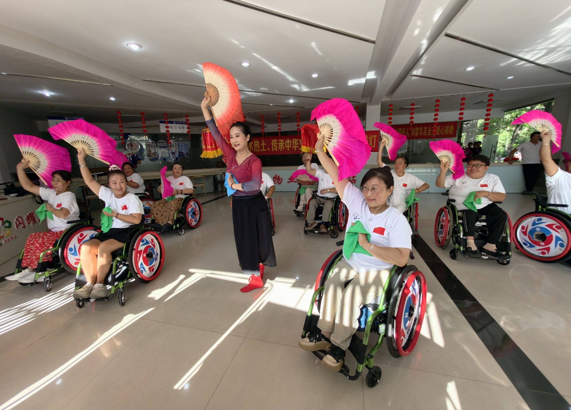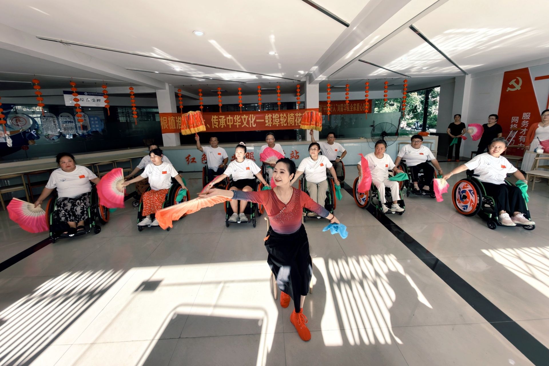 近日,安徽省蚌埠市秀水社區活動室內,一支特殊的“輪椅花鼓燈隊”開始了日常排練。在專業舞蹈老師的義務指導下,11名隊員正用扇子與絹花演繹著傳統花鼓燈的靈動。以往,社區殘疾人文藝活動多以朗誦、合唱為主,形式較為單一。一次偶然的討論中,團隊發起人丁蘇健提出:“為什么不把蚌埠特色的花鼓燈和輪椅舞蹈結合起來?”這一創意立刻得到了大家的積極響應。專業花鼓燈演員胡文芝,毫不猶豫地答應義務教學。花鼓燈藝術原本強調腰腿靈活、動作奔放,對輪椅上的學員來說是個巨大挑戰。胡文芝打破傳統教學模式,獨創“坐式教法”——她搬來凳子與學員平視,將需要大幅度肢體舒展的動作,巧妙拆解為扇法、絹花等精細的手部技巧。精心改編成適合輪椅表演的版本。經過一個多月的精心打磨,這支特殊的花鼓燈隊已經能夠完整演繹多個花鼓燈片段。9月,他們將首次登上社區“殘疾人文化進社區”文藝匯演的舞臺。當“東方芭蕾”遇上輪椅舞者,碰撞出的不僅是藝術的火花,更是生命的堅韌與光彩。
