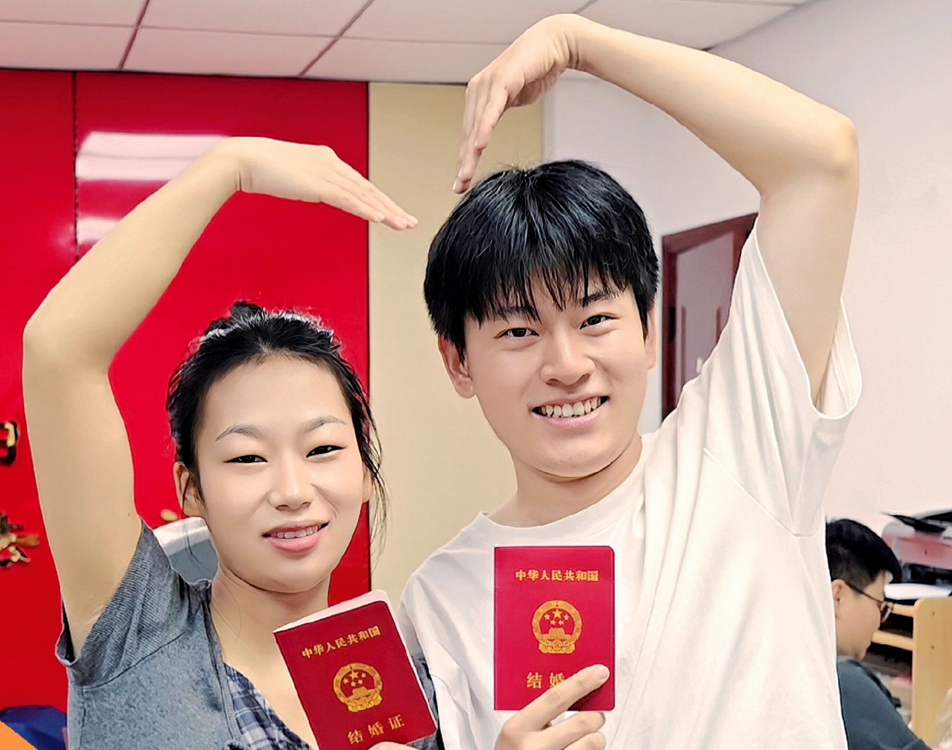 8月26日上午,婚姻登記處,一對新人手持結婚證,用手比心,臉上洋溢著燦爛笑容。