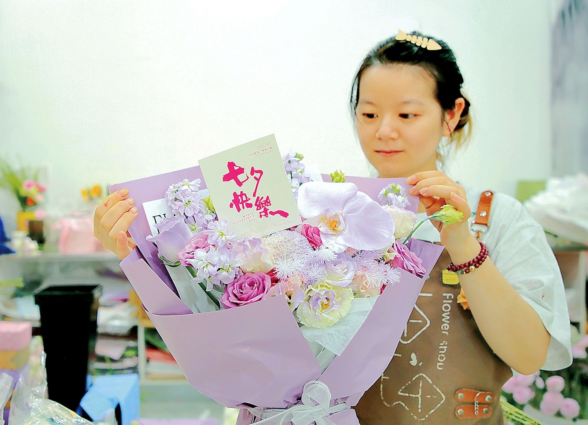 8月28日,一家花店里,工作人員正在包裝“七夕”花卉。