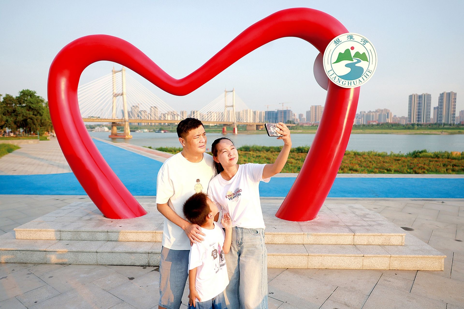 夫妻倆帶著孩子在“靚淮河”景區內合影,記錄幸福瞬間。