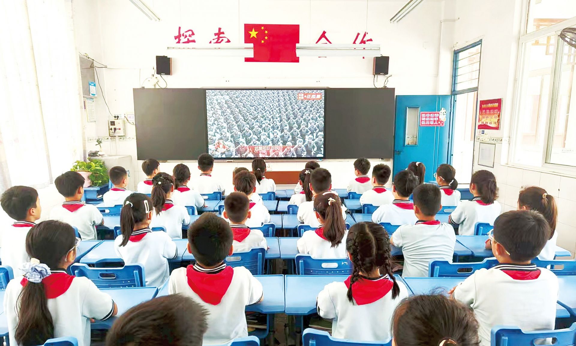 鳳陽路第二小學組織學生觀看閱兵儀式。陳昂 攝