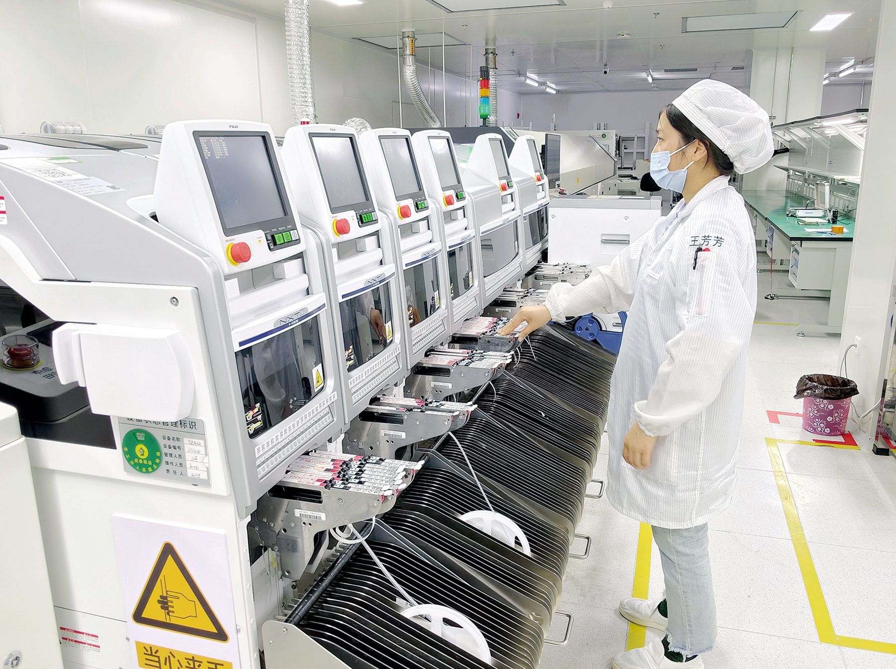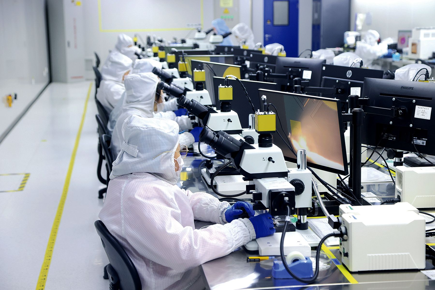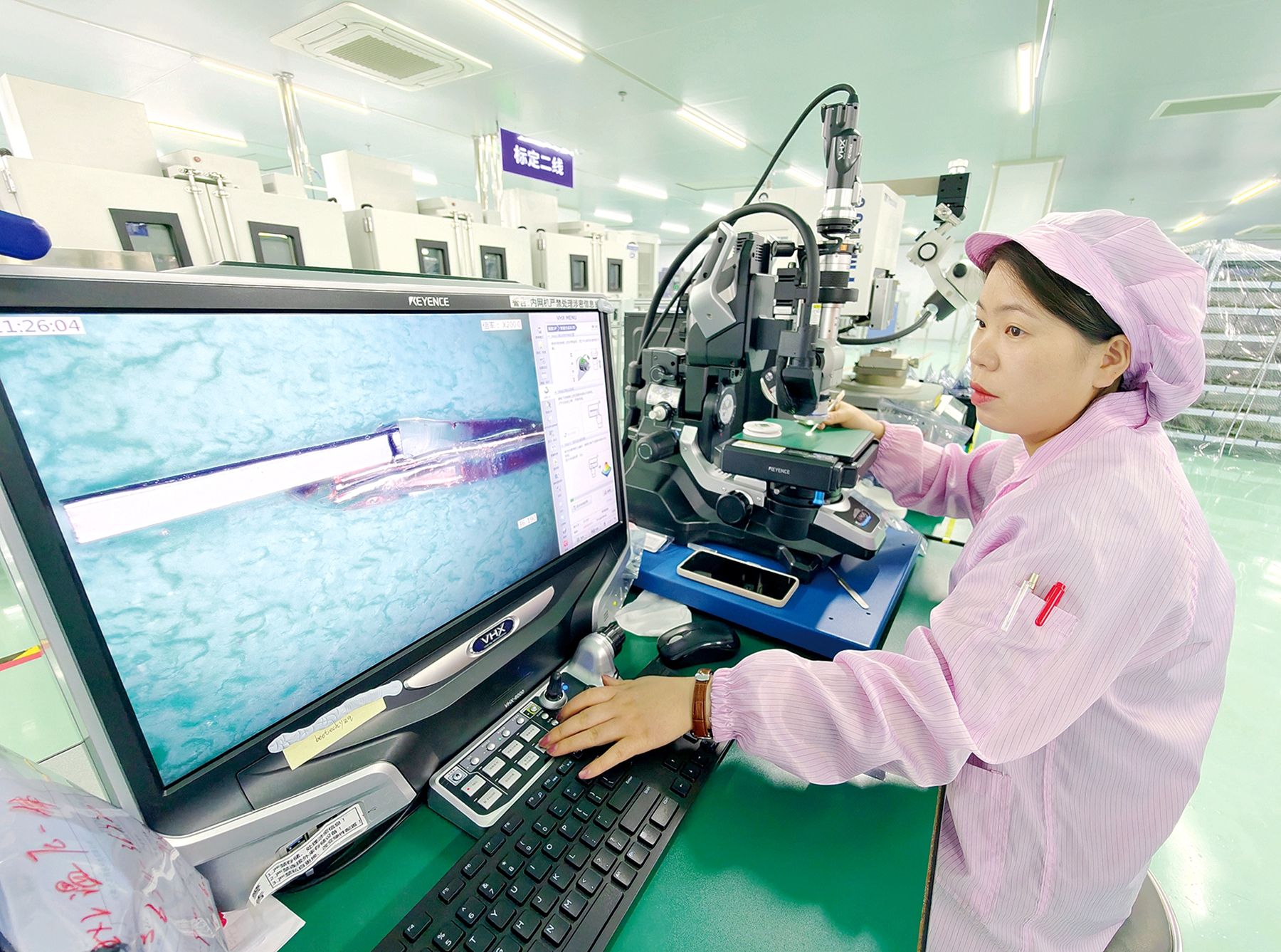 9月10日,安徽京芯傳感科技有限公司生產(chǎn)車間,工作人員使用光學(xué)顯微鏡對產(chǎn)品進(jìn)行檢測。