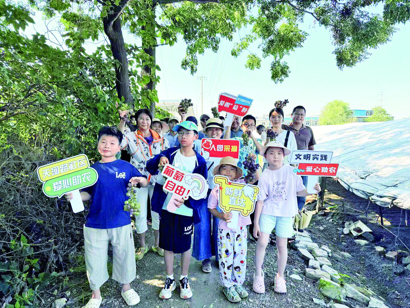近日,蚌埠高新區秦集鎮天河路社區組織親子家庭赴九龍村葡萄園開展助農采摘活動。孩子們化身“小果農”,在園主指導下學習葡萄品種與采摘技巧,興奮地尋找最甜的果實。家長們陪伴拍照,記錄溫馨瞬間。 王立春 李冬 攝