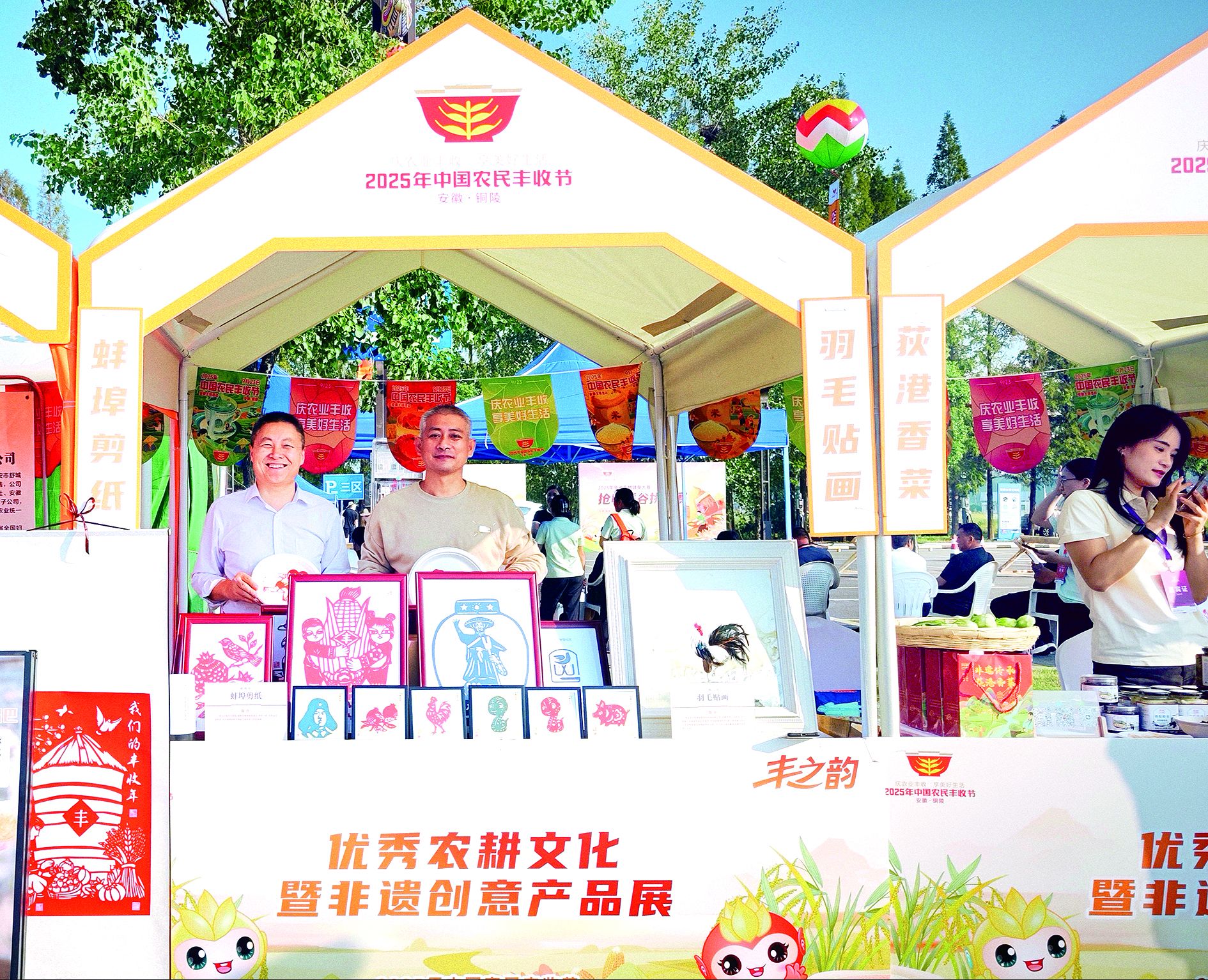 9月23日,在銅陵市舉辦的2025年中國農民豐收節安徽主場“優秀農耕文化·暨非遺創意產品展”上,蚌埠市非遺剪紙傳承人、鄉村工匠楊壽杰代表蚌埠市參加此次活動,將蚌埠文化元素融入豐收節主題,讓更多人感受蚌埠深厚的文化底蘊。楊常帥 攝