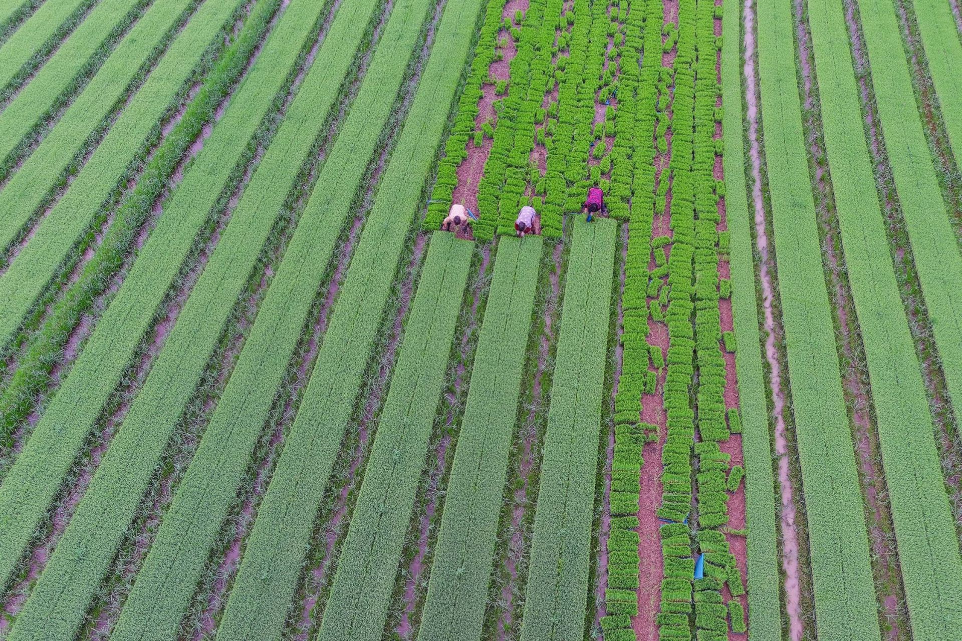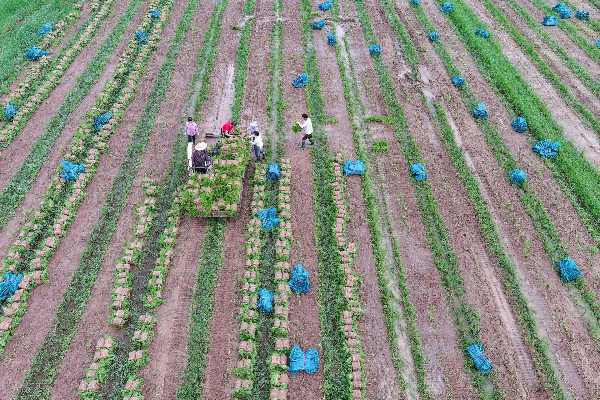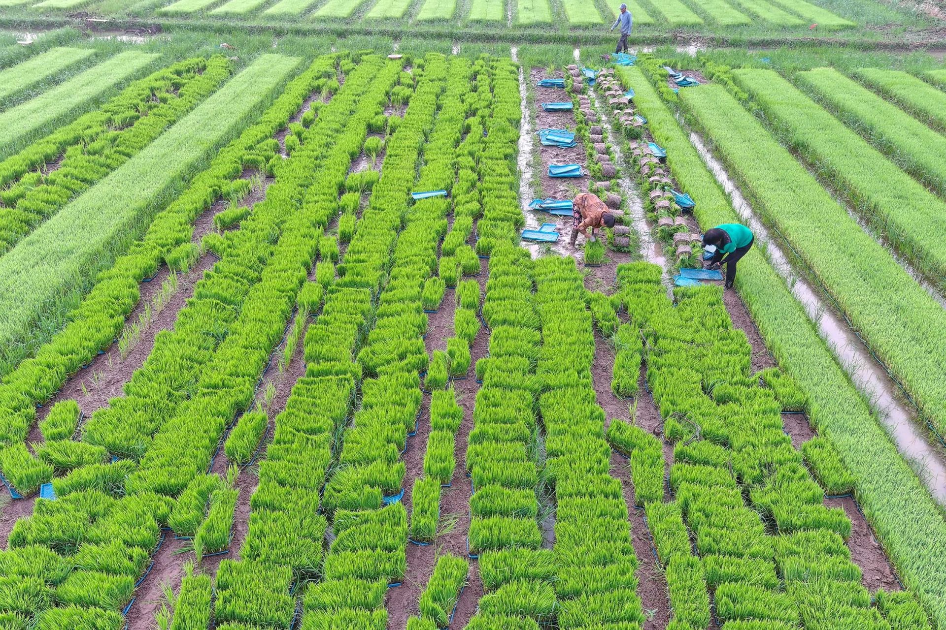 6月21日,夏至時節,安徽省蚌埠市五河縣沱湖鄉大崗村5000畝稻漁綜養基地一片繁忙,村民正在忙著起秧苗、插秧工作。眼下正值插秧時節,沱湖鄉大崗村正在組織大型插秧機械和人力,奮力保障秋季作物全面播種完成,確保全年糧食生產穩定。目前,五河縣擁有各種類型插秧機1353臺,其中高速插秧機占比60%,預計今年機插秧面積可達27萬畝,占全縣水稻種植面積的近5成。