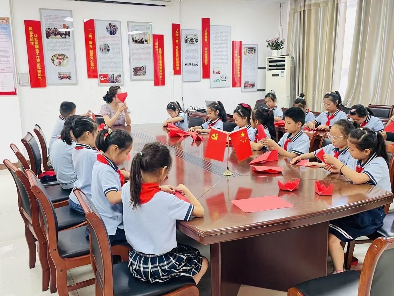 在文竹苑社區(qū)黨員會(huì)議室內(nèi),來自蚌埠第三實(shí)驗(yàn)學(xué)校的徐璐潔老師用覆著粉筆灰的手掌與孩子們稚嫩的小手共同折疊鮮紅卡紙。“這一道折痕是1921年南湖的星火。”徐老師將金粉點(diǎn)綴在船頭,“下一道折痕是載人飛船探秘深空的2035!”孩子們將寫有夢(mèng)想的紙條藏進(jìn)船艙——“我要造智能紅船守護(hù)祖國(guó)海疆!”“我想在月球上種我喜歡吃的小西瓜!”三十艘“初心紅船”在黨員會(huì)議室匯成星河,船頭黨徽在燈光下如炬火閃耀。
