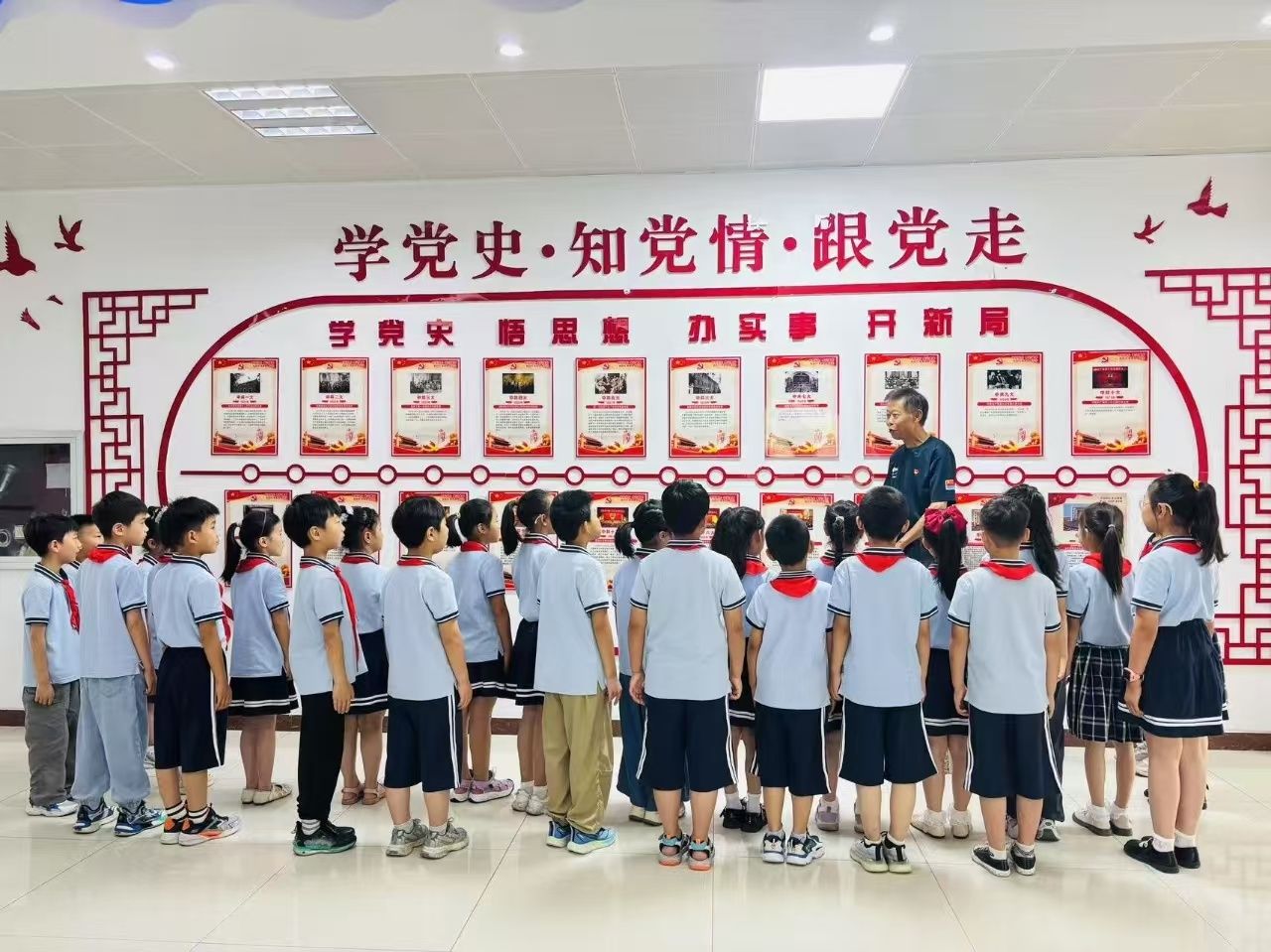 文竹苑社區(qū)紅色黨史學(xué)習(xí)教育長(zhǎng)廊里,黃旭彬作為老兵宣講團(tuán)成員,以生動(dòng)形象的黨史故事為切入點(diǎn),帶領(lǐng)孩子們通過一張張照片了解黨史中的重大事件、重大成就和典型人物、動(dòng)人故事。通過沉浸式的黨史、黨情參觀學(xué)習(xí),孩子們更加深刻地認(rèn)識(shí)到胸前紅領(lǐng)巾的意義,紛紛表示要努力成為能夠擔(dān)當(dāng)民族復(fù)興大任的時(shí)代新人。