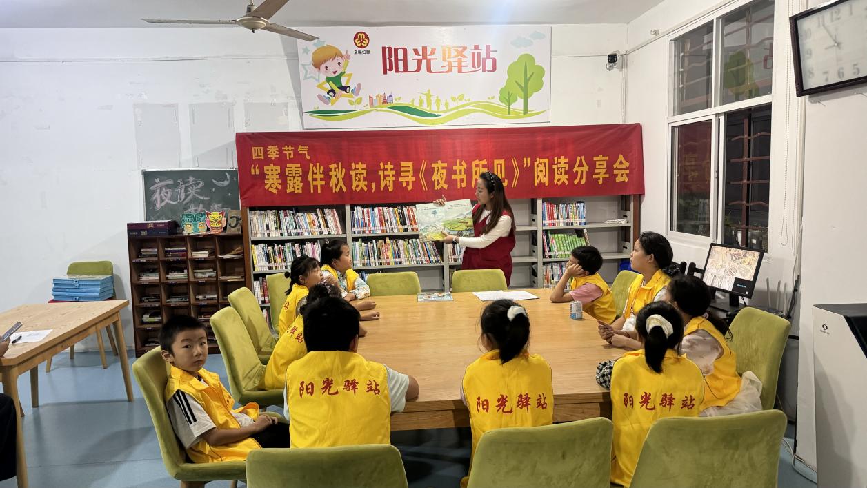 志愿者老師首先科普寒露知識:解讀“鴻雁來賓”“雀入大水為蛤”“菊有黃華”的物候,分享吃芝麻、飲秋茶的習俗,老師講得認真,小讀者們聽得專注。隨后,老師為大家分享宋代葉紹翁的名作《夜書所見》,講解“蕭蕭梧葉送寒聲,江上秋風動客情”的含義與思鄉意境,孩子們跟著誦讀,互動熱烈。